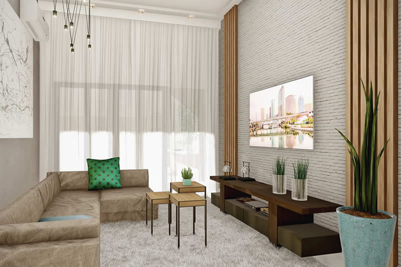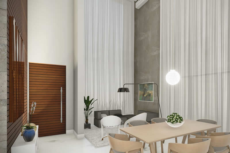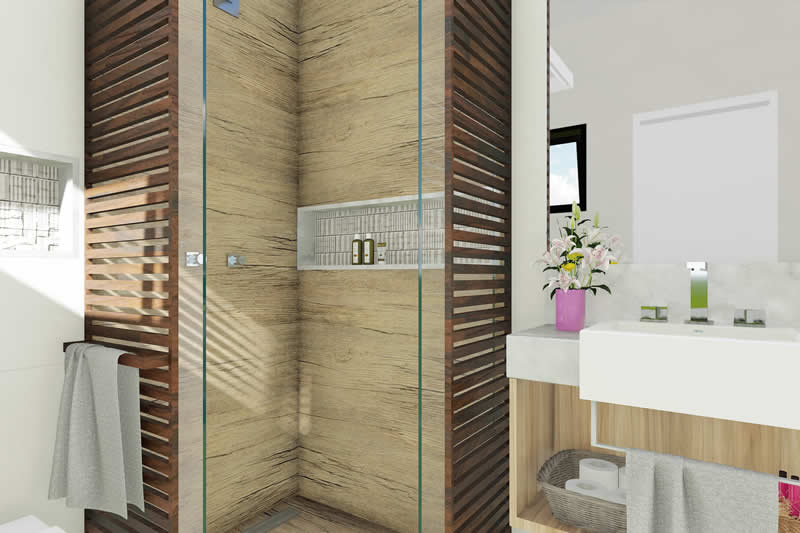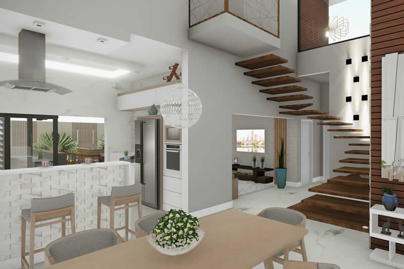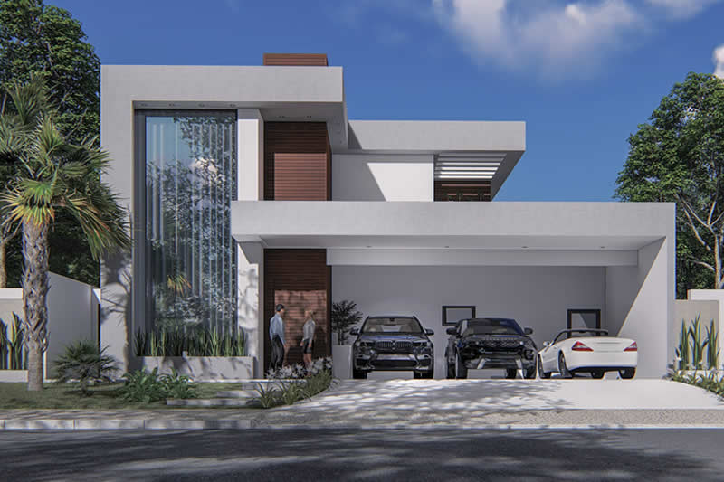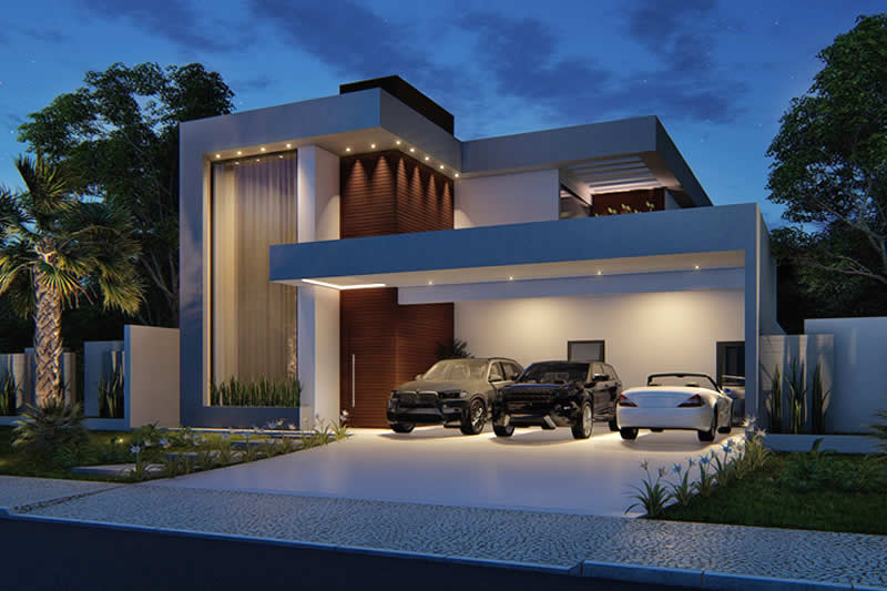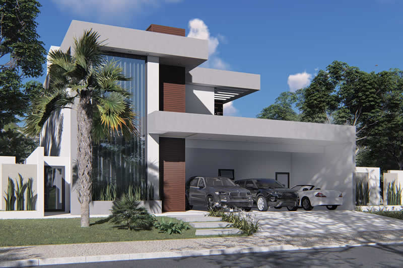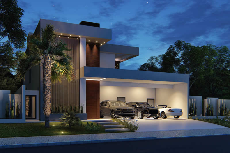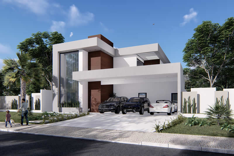 Esse projeto tem o mérito de ser imponente, mas sem perder a racionalidade. Com uma fachada moderna em alvenaria, madeira e vidro o seu mestre de obras não terá grandes dificuldades em construir esse sobrado, uma vez que as paredes são paralelas e os beirais são uma continuação da laje, diminuindo significativamente os custos. Por dentro temos uma espaçosa área de convívio, além de 3 suítes, todas com closet. Dando maior privacidade e conforto no dia a dia.
