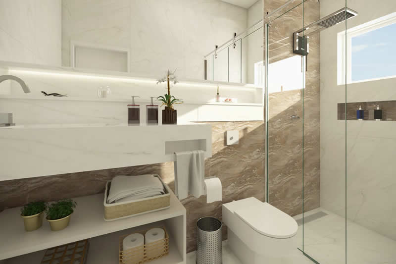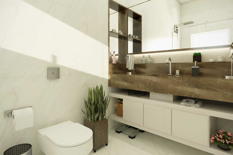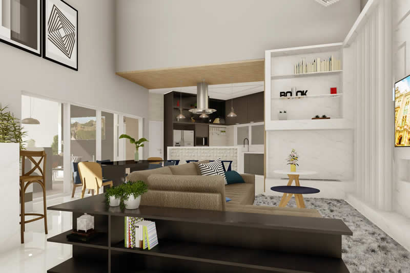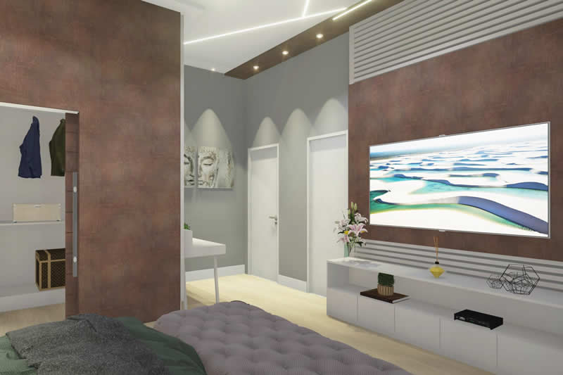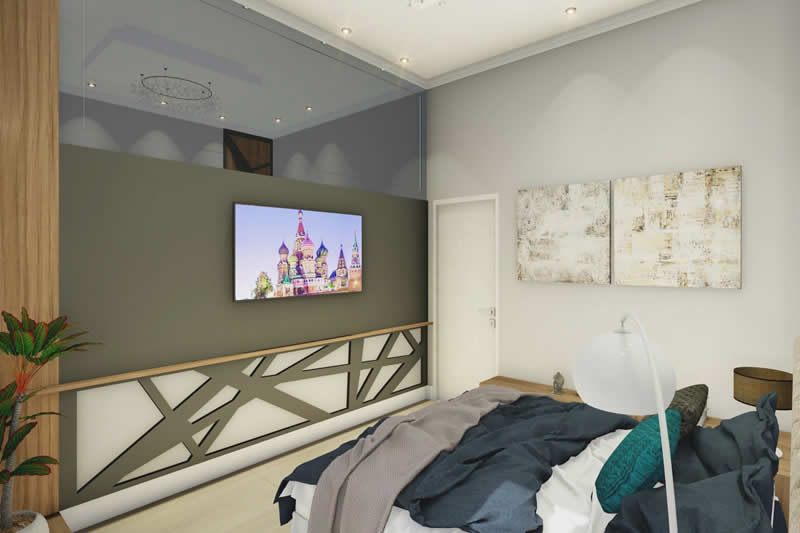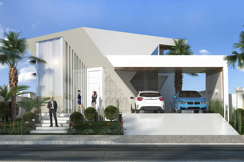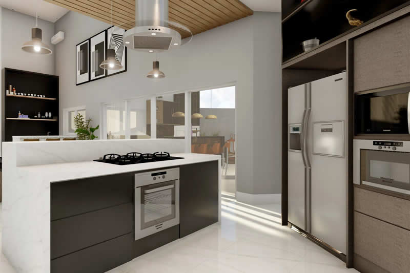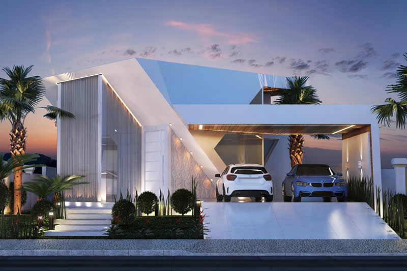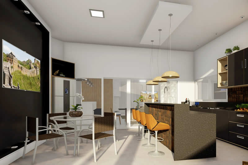 Se você quer morar em uma residência com o conforto e a praticidade de uma casa térrea, mas não abre mão da imponência de uma fachada moderna, esse pode ser o seu projeto ideal. Pensada para um condomínio de alto padrão, essa casa é dividida em dois setores. A da frente com ambientes integrados para o lazer e o convívio entre os familiares. Já nos fundos privilegiamos a parte íntima, dando maior privacidade aos quartos e banheiros.