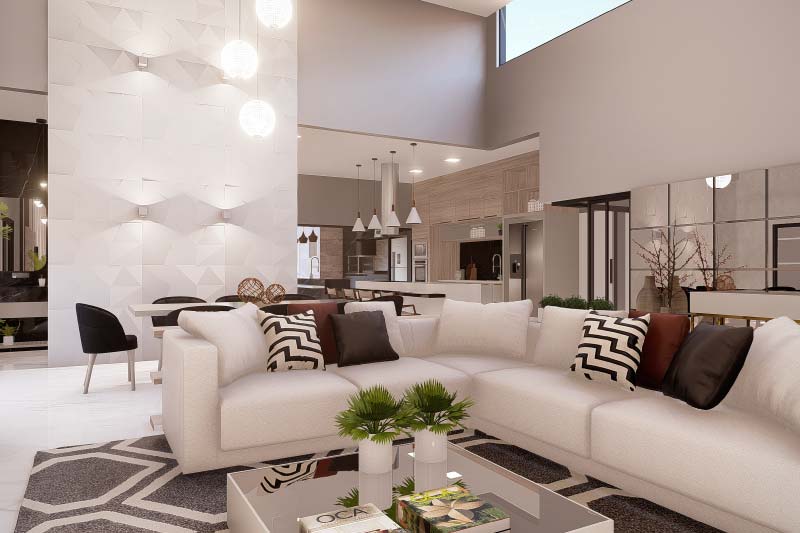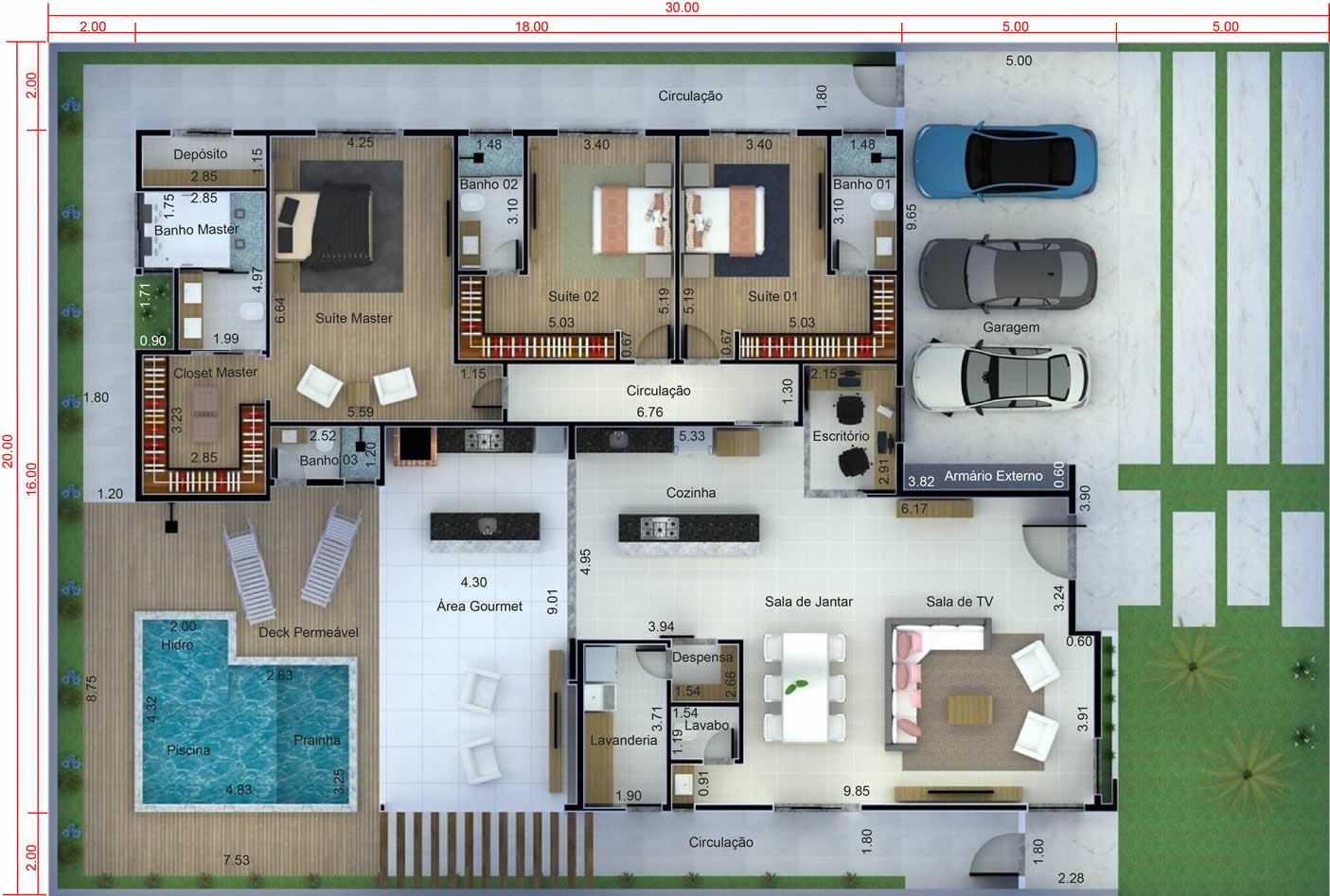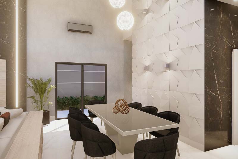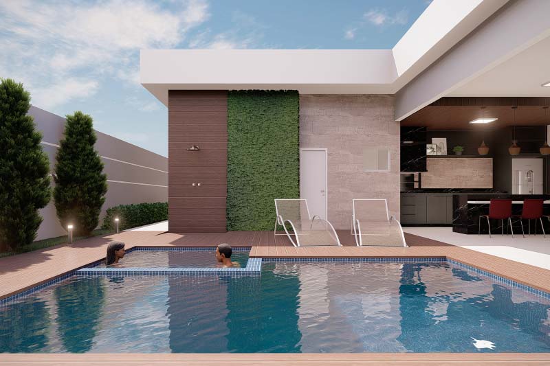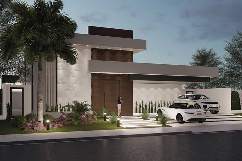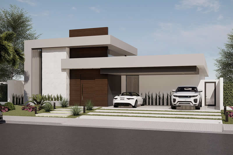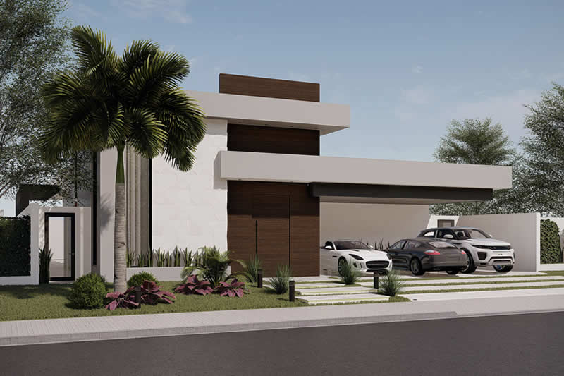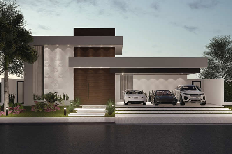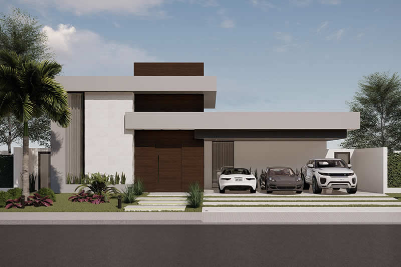 Com uma fachada moderna com 3 vagas na garagem, esse é um projeto para você que tem um terreno grande e quer uma casa espaçosa, porém térrea. Um dos maiores desafios de um projeto de casa térrea é dividir bem a parte social do setor mais íntimo. E foi exatamente isso que fizemos aqui. De um lado temos uma sequência de cômodos integrados, ideal para receber amigos e familiares, enquanto que do outro ficam os cômodos mais privativos, como quartos, closet e banheiro. Tudo com acesso fácil e sem escadas.