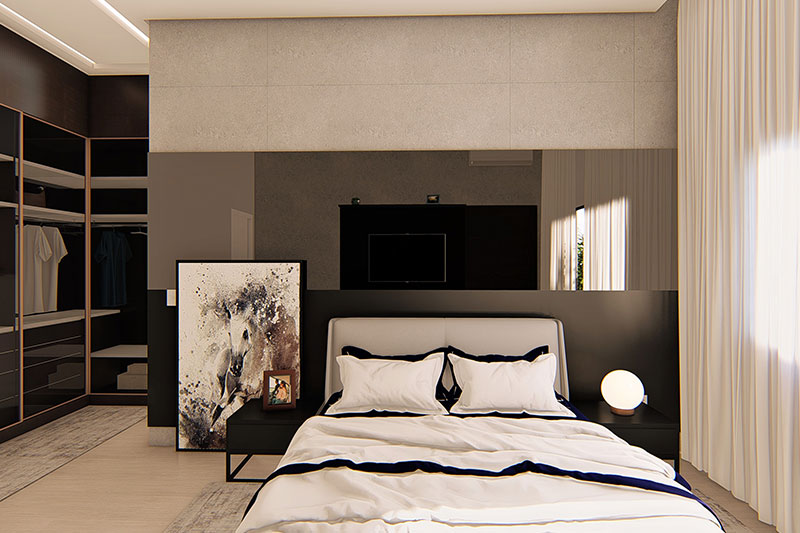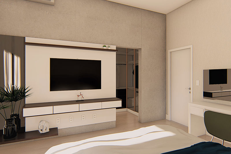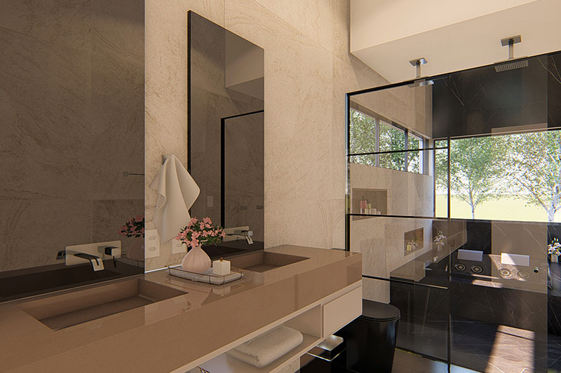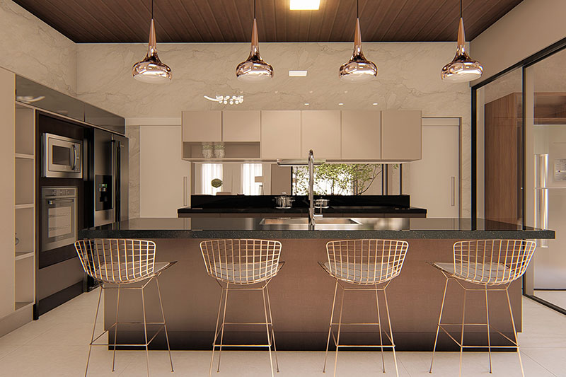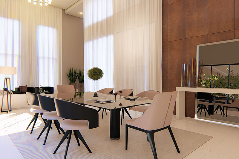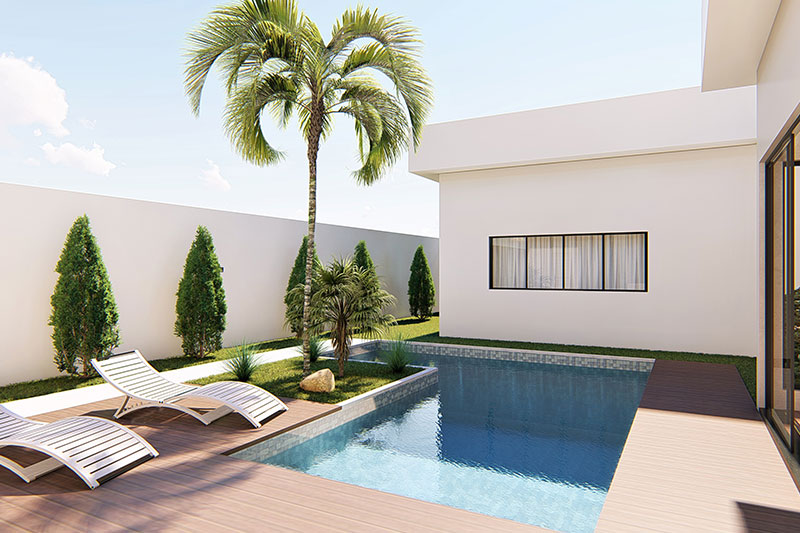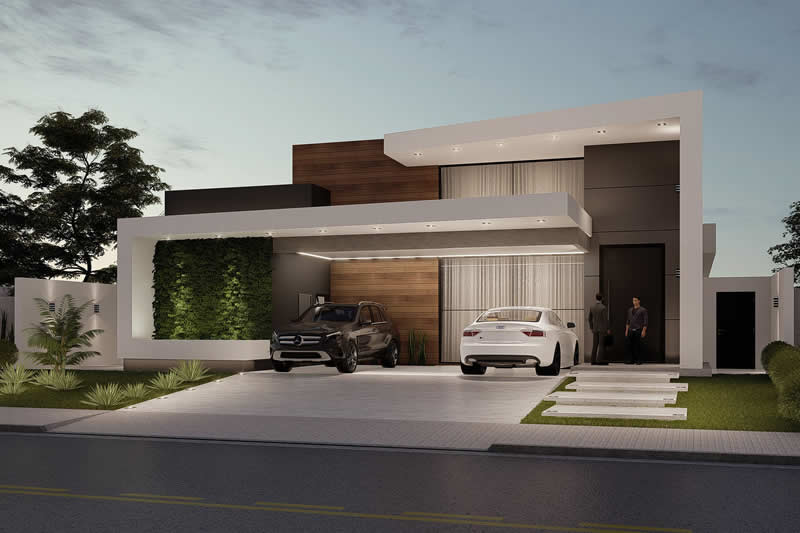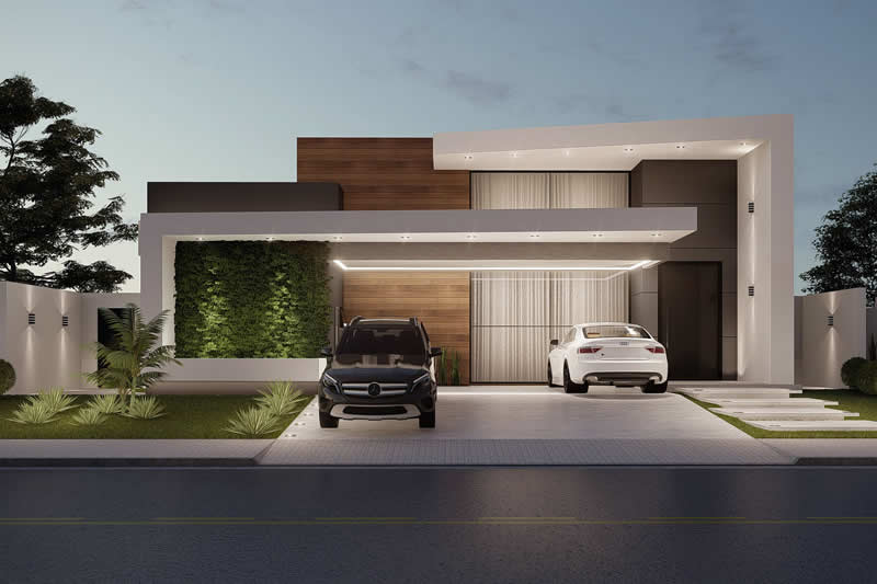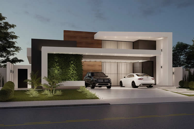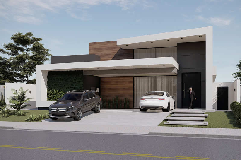 Uma das maiores vantagens quando se tem um terreno grande, é poder construir uma casa completa e espaçosa sem escadas. Mas não pense que por se tratar de uma casa térrea a sua fachada será menos imponente. Com um pé direito alto, vidro e madeira, essa é uma das melhores fachadas que já fizemos. Fica difícil passar em frente sem se impressionar. O interior não fica para trás. Por dentro temos cômodos espaçosos com destaque para as 4 suítes, área gourmet com piscina e até uma academia.
