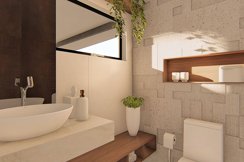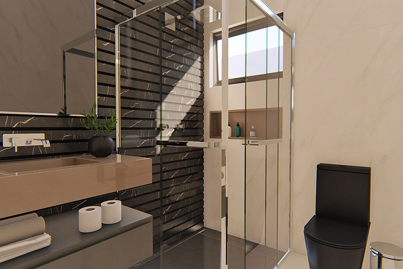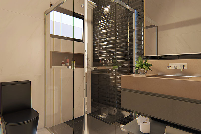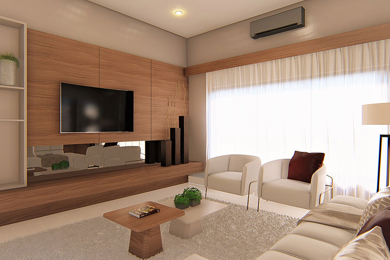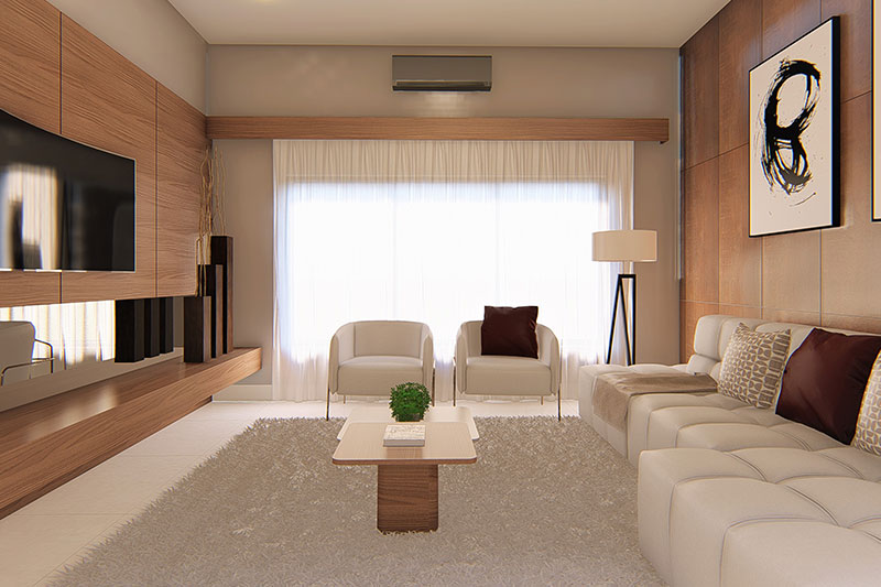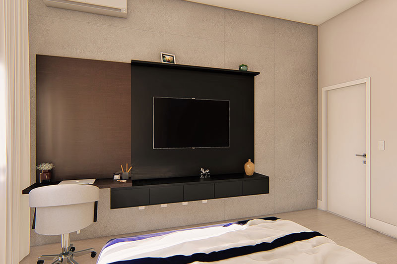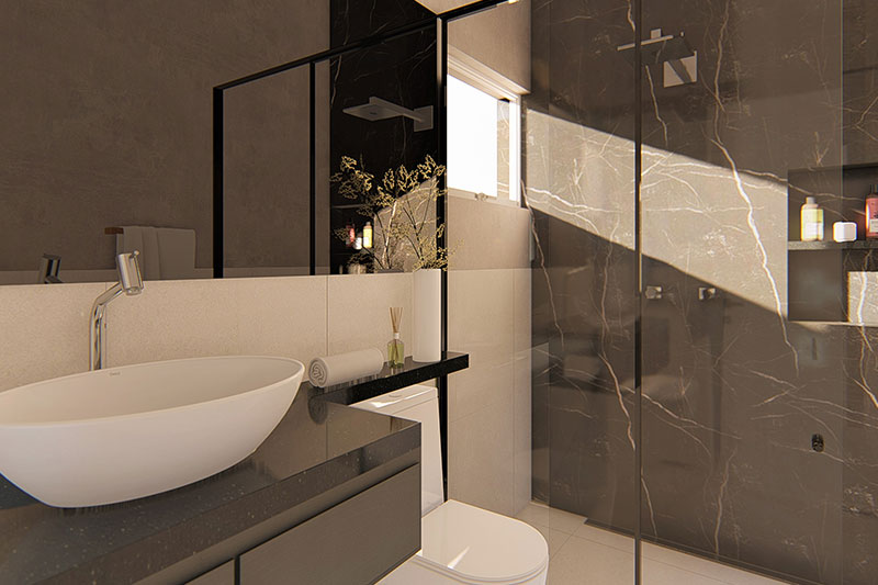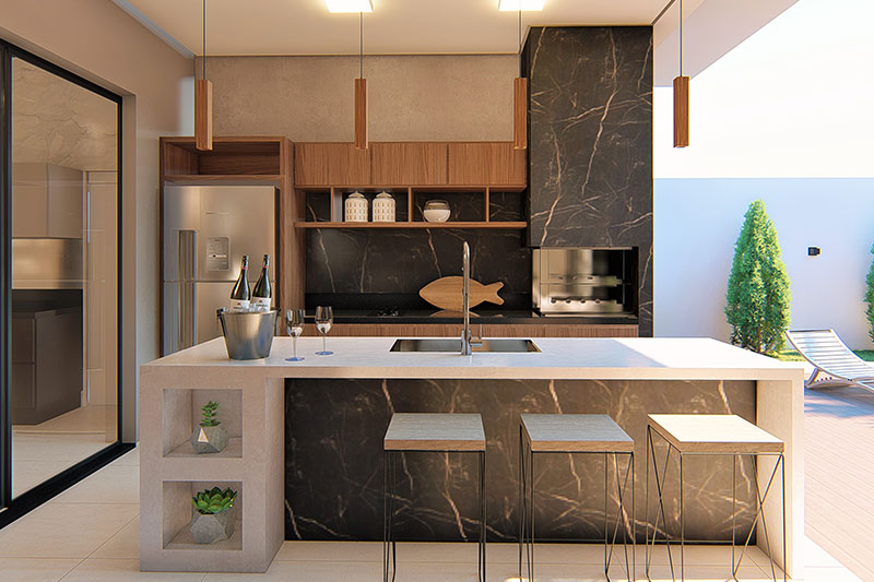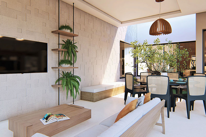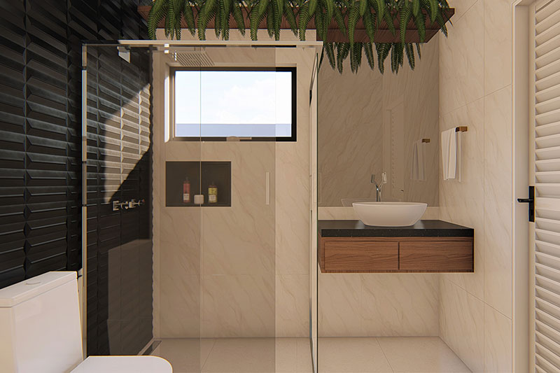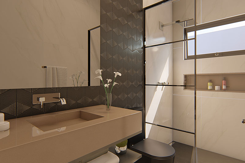 Uma das maiores vantagens quando se tem um terreno grande, é poder construir uma casa completa e espaçosa sem escadas. Mas não pense que por se tratar de uma casa térrea a sua fachada será menos imponente. Com um pé direito alto, vidro e madeira, essa é uma das melhores fachadas que já fizemos. Fica difícil passar em frente sem se impressionar. O interior não fica para trás. Por dentro temos cômodos espaçosos com destaque para as 4 suítes, área gourmet com piscina e até uma academia.