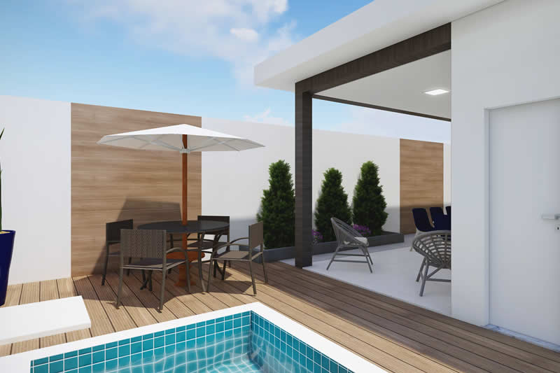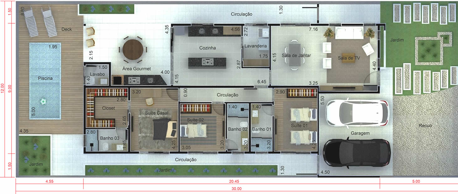 Aproveite ao máximo o seu terreno de 12 por 30 metros com esse projeto de casa térrea para condomínio. Com uma espaçosa sala de tv integrada a sala de jantar, essa casa conta ainda com cozinha próxima a lavanderia e área gourmet. Os três dormitórios ficam bem separado da área de convívio dando mais privacidade aos moradores.