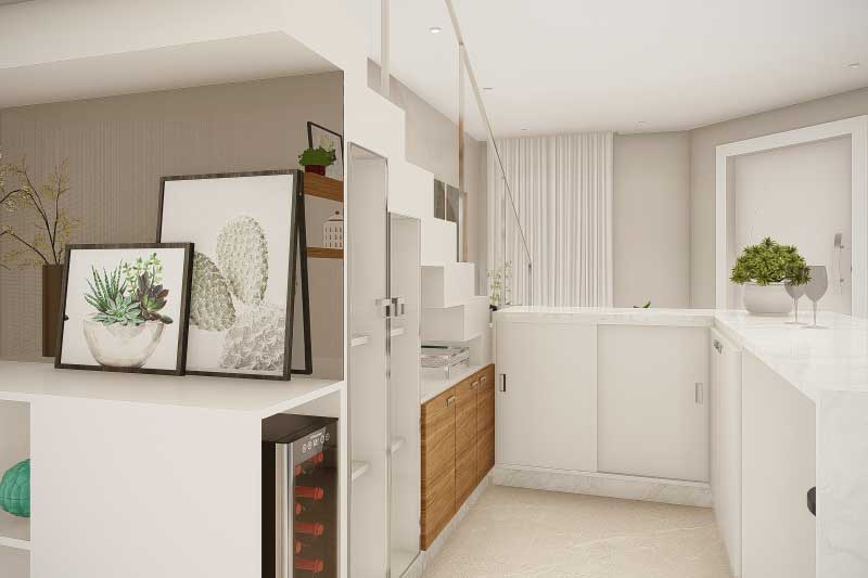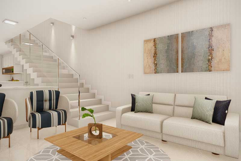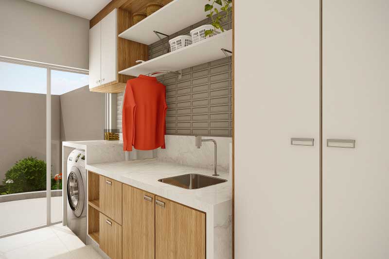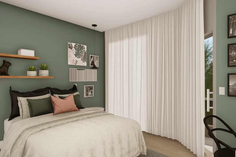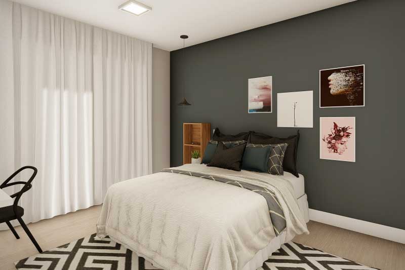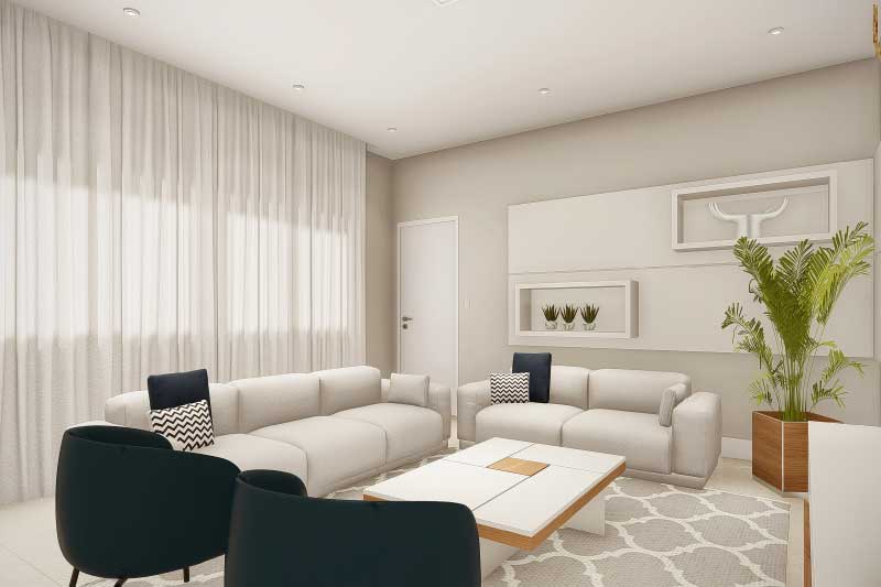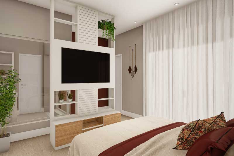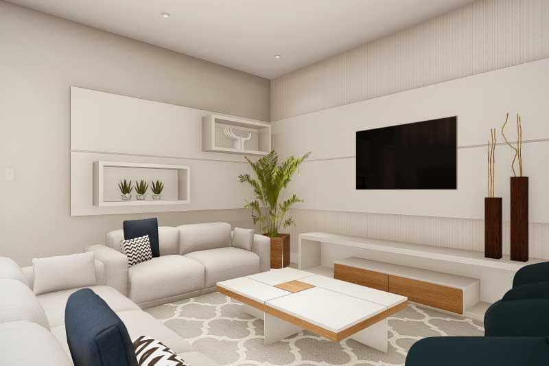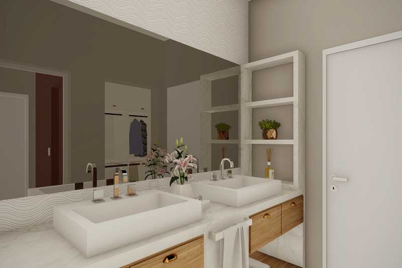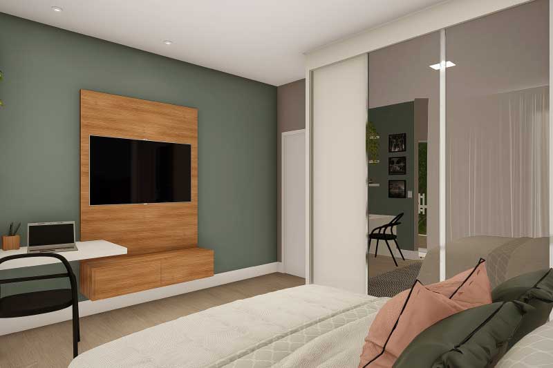 Esse projeto foi criado para uma família que não gostaria da construção de um sobrado completo, mas que mantém uma ideia de um dormitório no piso superior para garantir uma intimidade e melhor aproveitamento dos espaços livres do terreno. A organização dos ambientes prevê uma separação natural dos dormitórios com a área social da casa. Sobre a sala de tv foi projetado um mezanino que dá acesso para a varanda e para a suíte do casal.