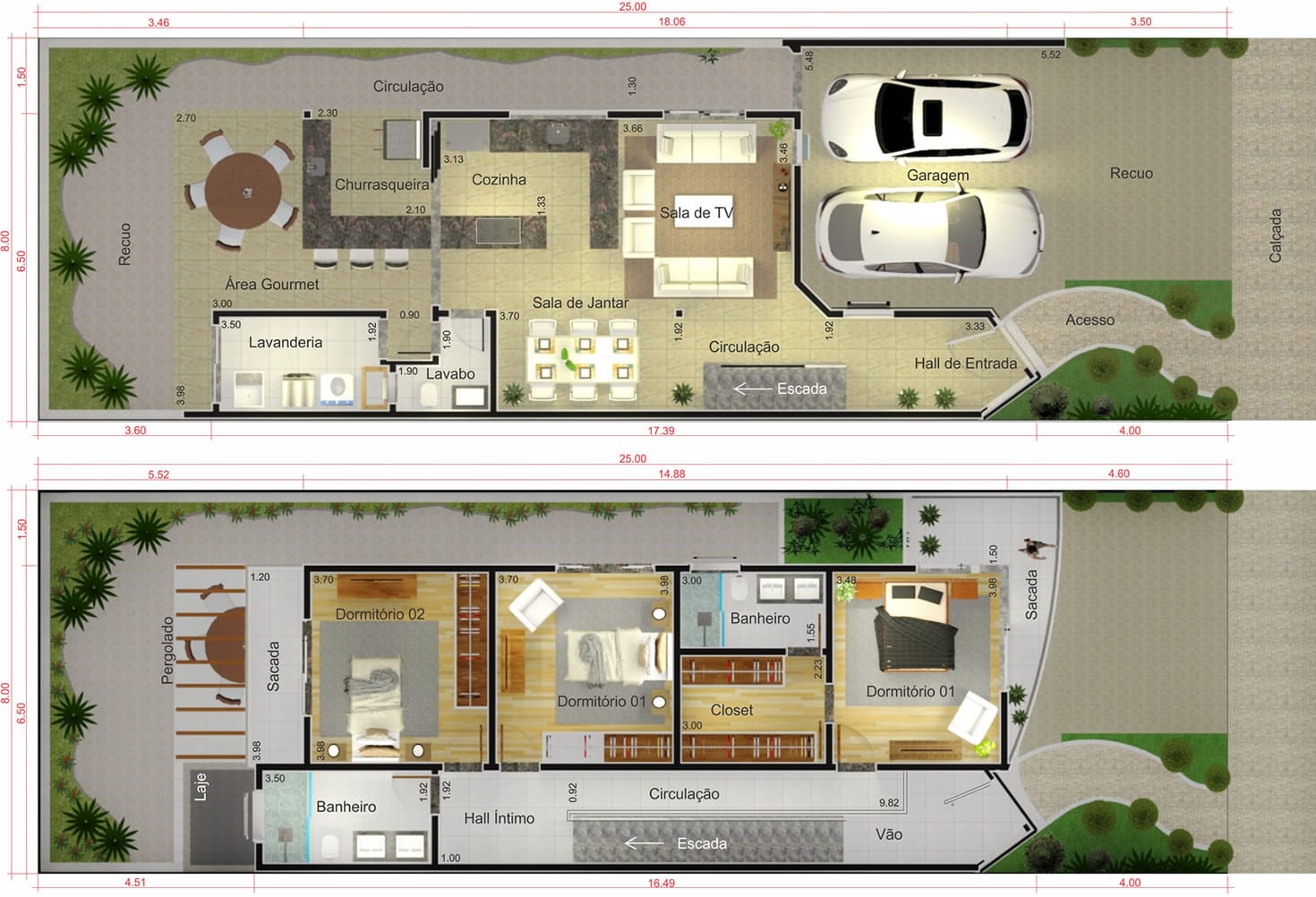 Que tal construir uma casa com ambientes muito bem planejados? Este é um bom exemplo de projeto, pois possui uma suíte master com sacada para a rua, deixando o lindo design da fachada em curva. Seus outros dois dormitórios estão bem localizados no interior do terreno, além de contar com uma ótima circulação para o banheiro, tornando-o bem discreto. Toda a parte interior da residência foi pensada para uma ótima circulação, todos os acessos permitem que seus móveis tenham seu devido lugar. No pavimento térreo, ordenamos os ambientes para compor uma área totalmente integrada. Com portas de correr embutidas no fundo da cozinha, você terá a opção de abri-las integrando a casa com a área gourmet. Sua área de serviço tem um acesso discreto, com saída para os fundos. Olhe bem esta fachada, imagine se ela não irá tirar suspiros em sua rua.