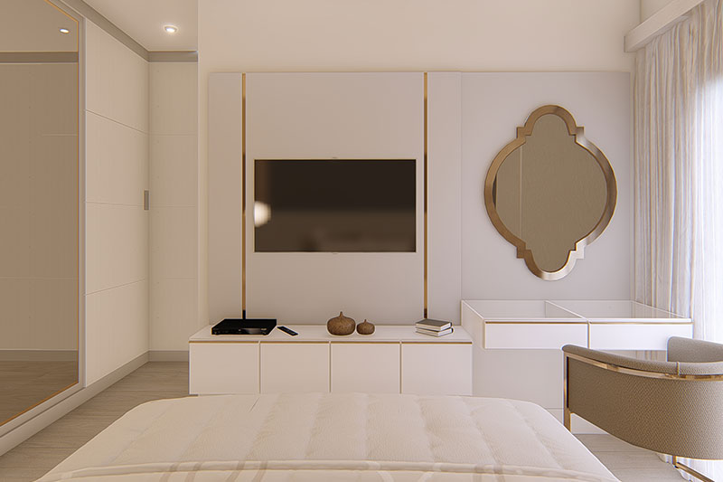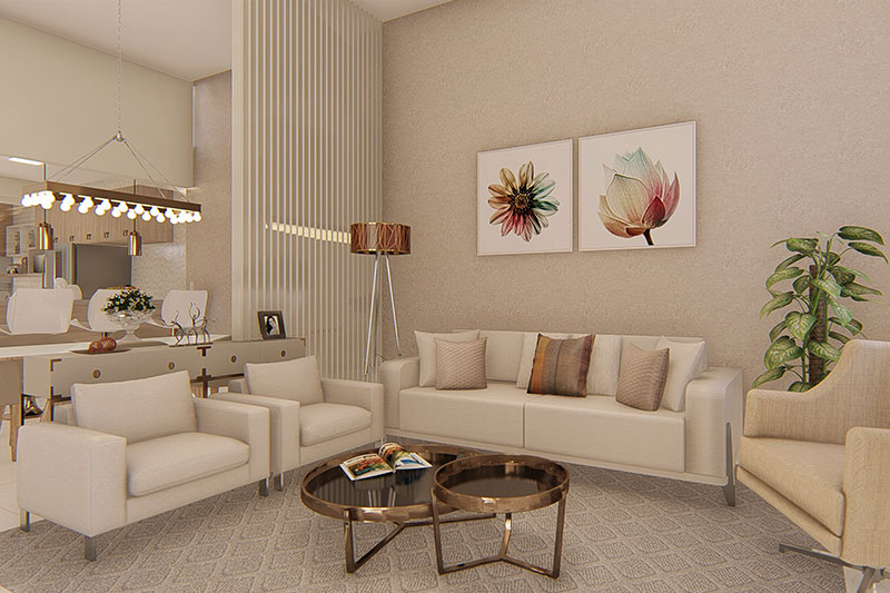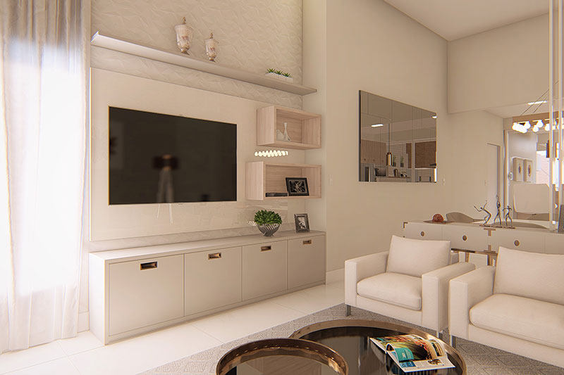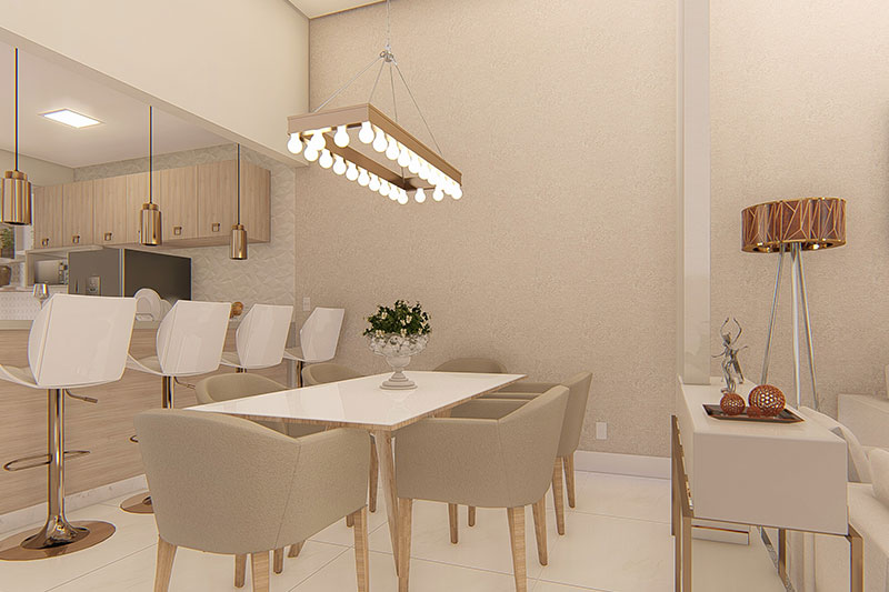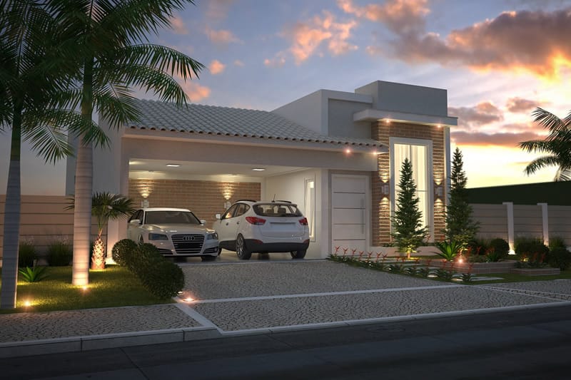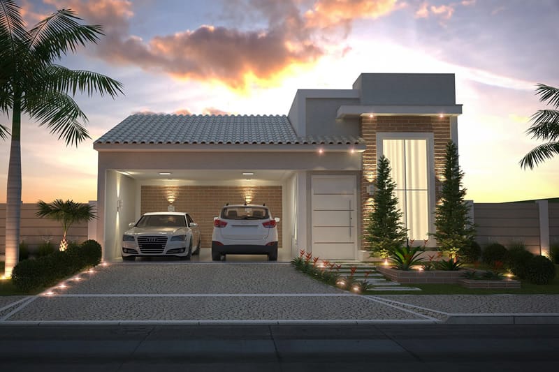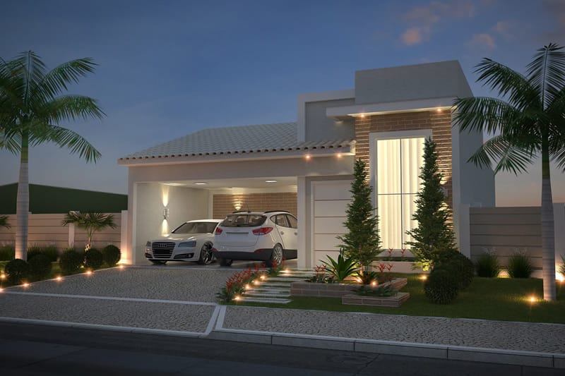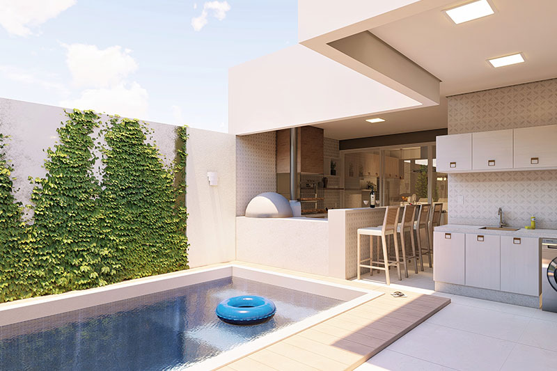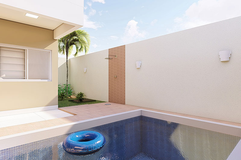 Esse projeto foi desenvolvido para um terreno de 10x25 metros, sua fachada trabalha uma mistura de telhado aparente com platibanda. A casa possui uma área de luz para o dormitório 1 e suíte master, transmitindo serenidade com a entrada de luz solar. A sala de jantar e a cozinha estão integradas no interior da casa, e a área gourmet completa a área de lazer com piscina.
