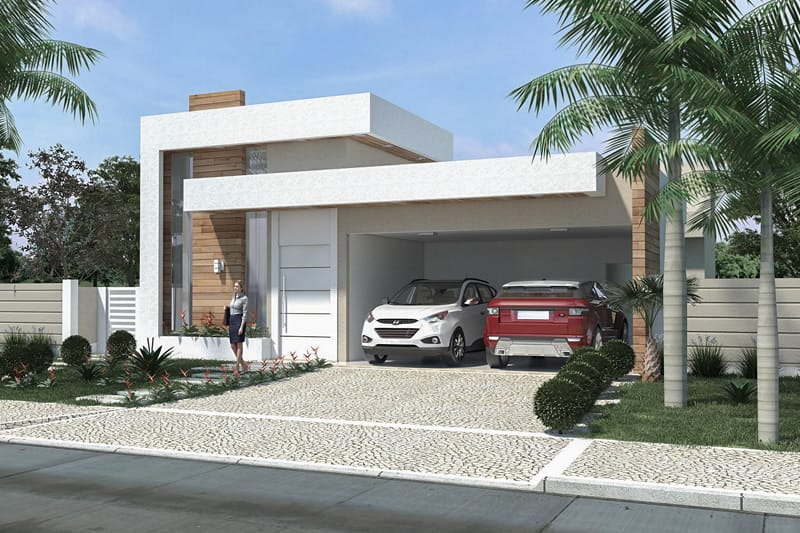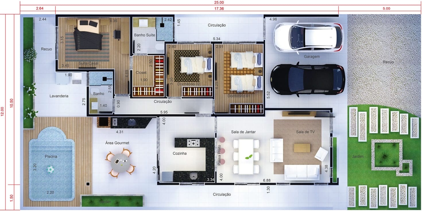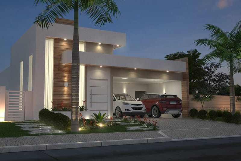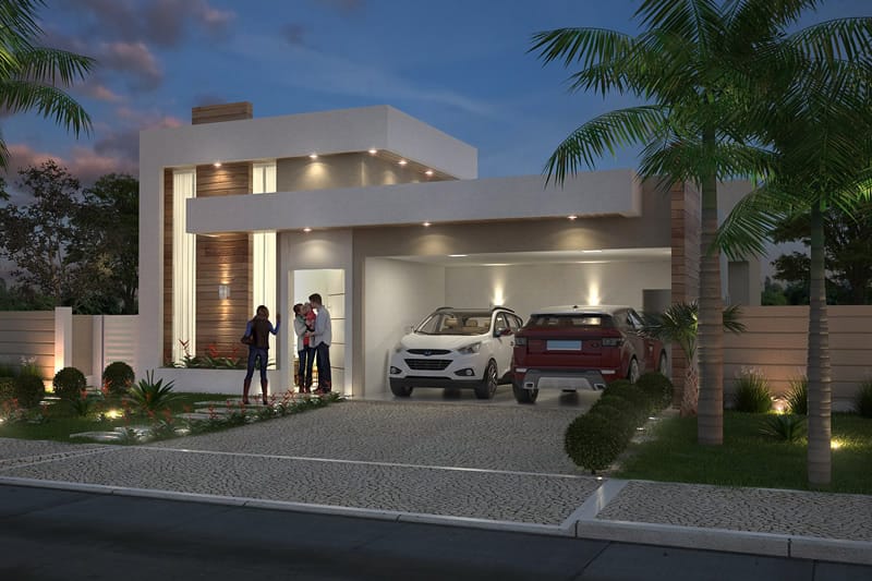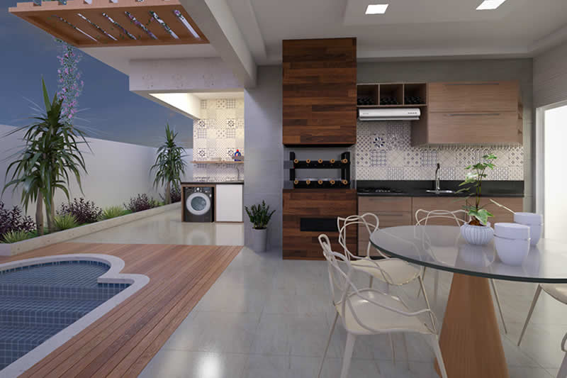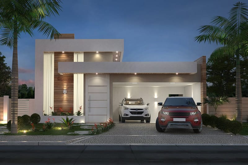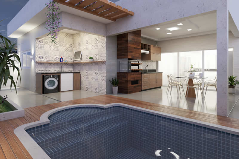Essa casa possui uma das fachadas mais bonitas que já fizemos. A sala de tv com pé direito alto, valoriza os detalhes em vidro e revestimentos que simulam madeira para quem olha de fora. Mais adiante temos a sala de jantar, cozinha, área gourmet e piscina que juntas finalizam a área de convívio. Na outra metade desta planta, ficam os cômodos íntimos, com dois dormitórios e uma suíte com closet.