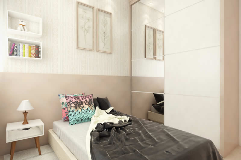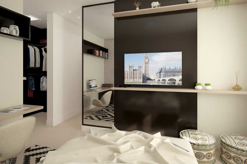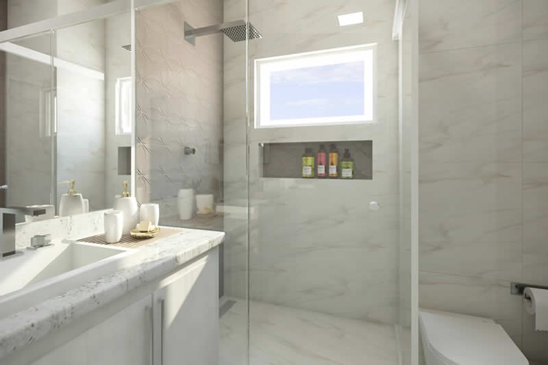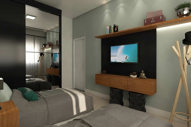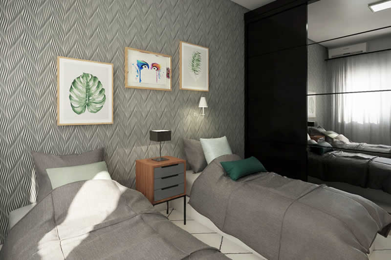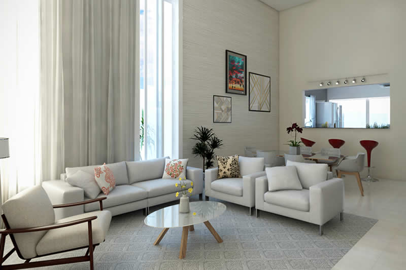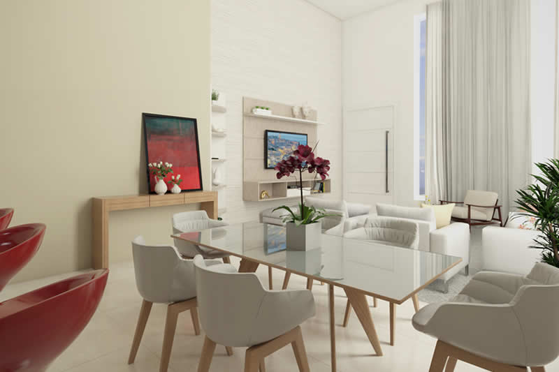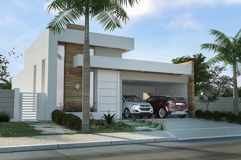 Essa casa possui uma das fachadas mais bonitas que já fizemos. A sala de tv com pé direito alto, valoriza os detalhes em vidro e revestimentos que simulam madeira para quem olha de fora. Mais adiante temos a sala de jantar, cozinha, área gourmet e piscina que juntas finalizam a área de convívio. Na outra metade desta planta, ficam os cômodos íntimos, com dois dormitórios e uma suíte com closet.