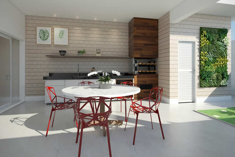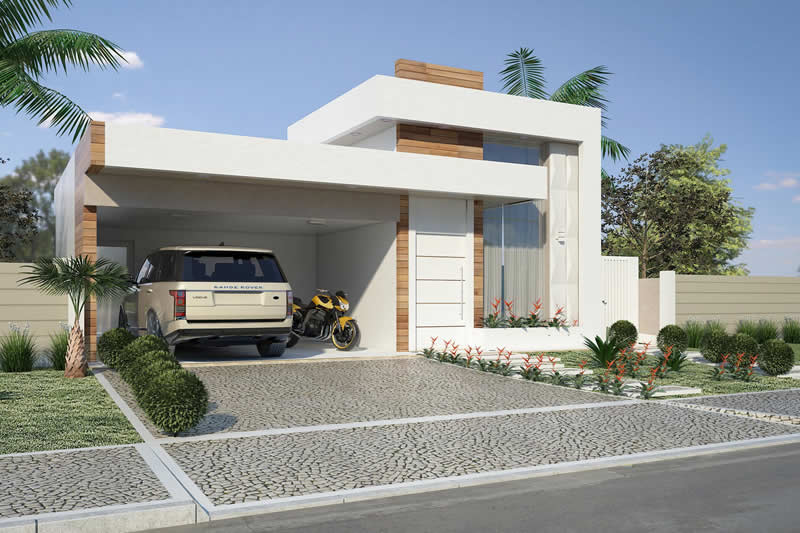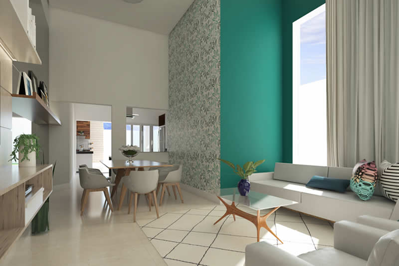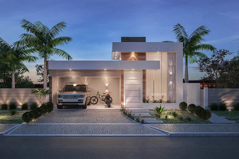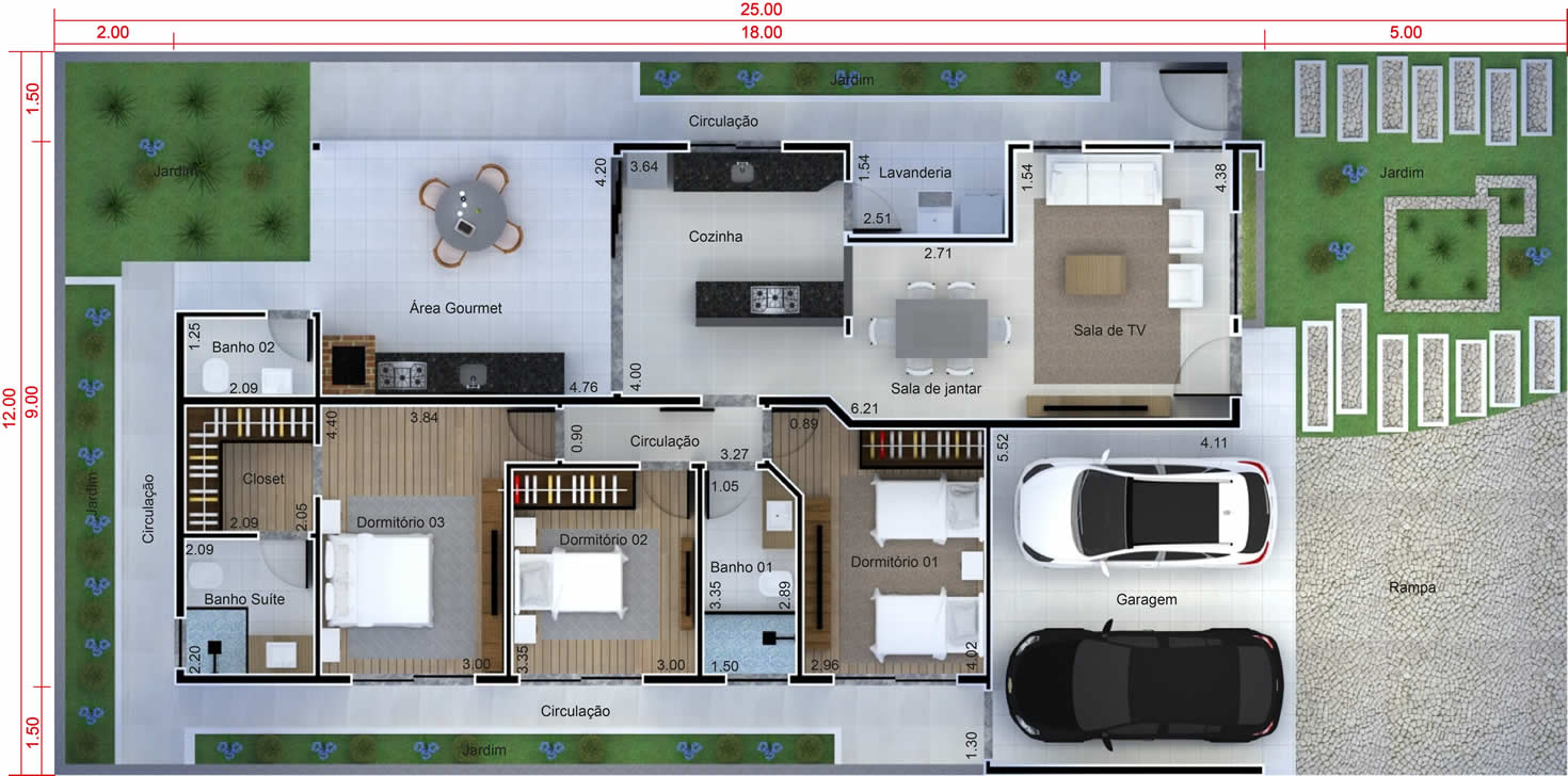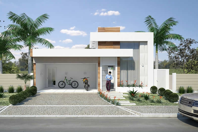 Esse é um ótimo exemplo de planta moderna e funcional, onde os cômodos de convívio são integrados e os íntimos ficam separados da área social por um corredor, dando mais privacidade aos moradores. Essa casa conta com duas vagas na garagem coberta, sala de tv e jantar integradas, e mais ao fundo a cozinha, próxima da lavanderia e da área gourmet. No lado íntimo são 3 quartos, sendo o do casal com closet e suíte.