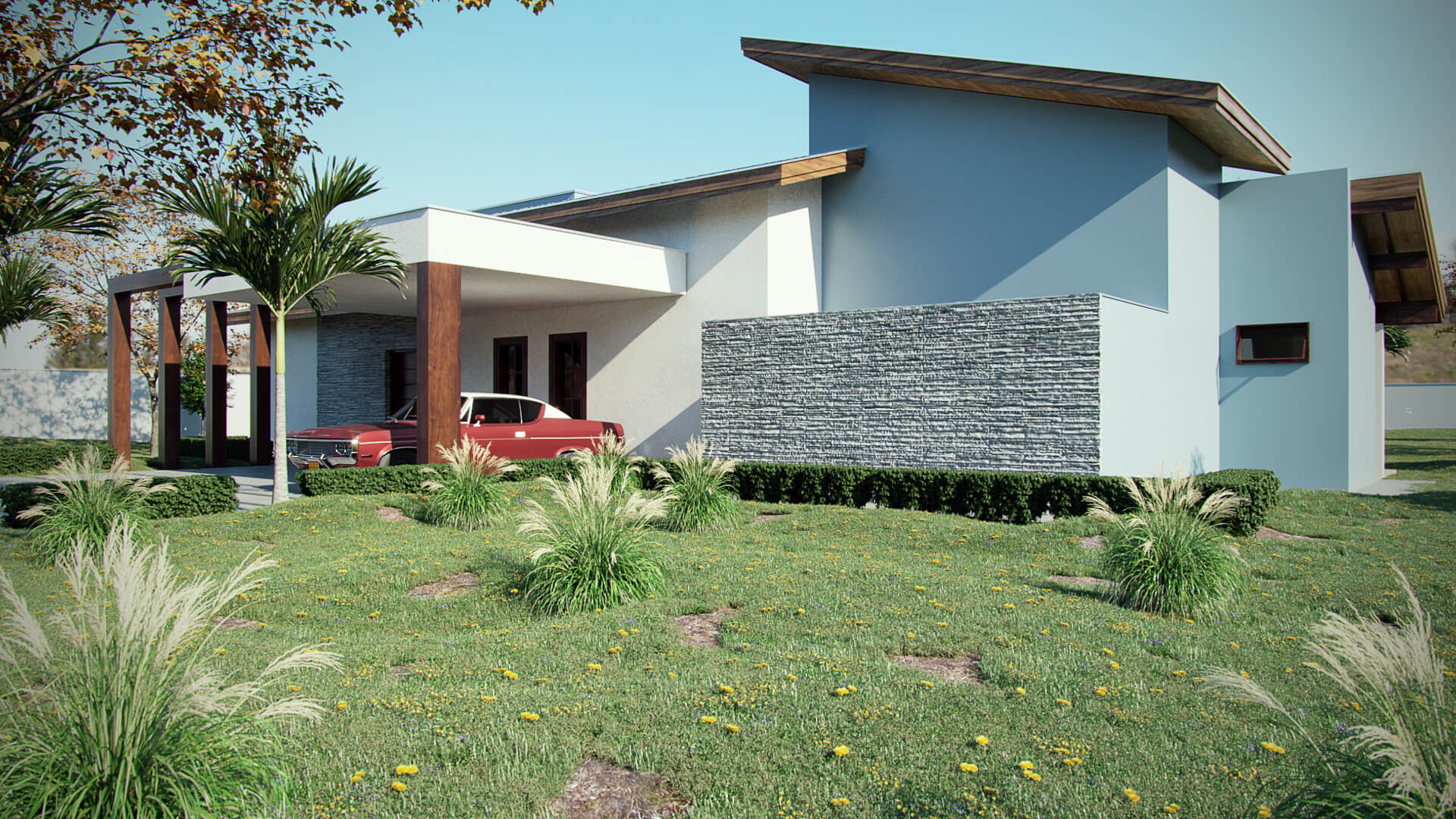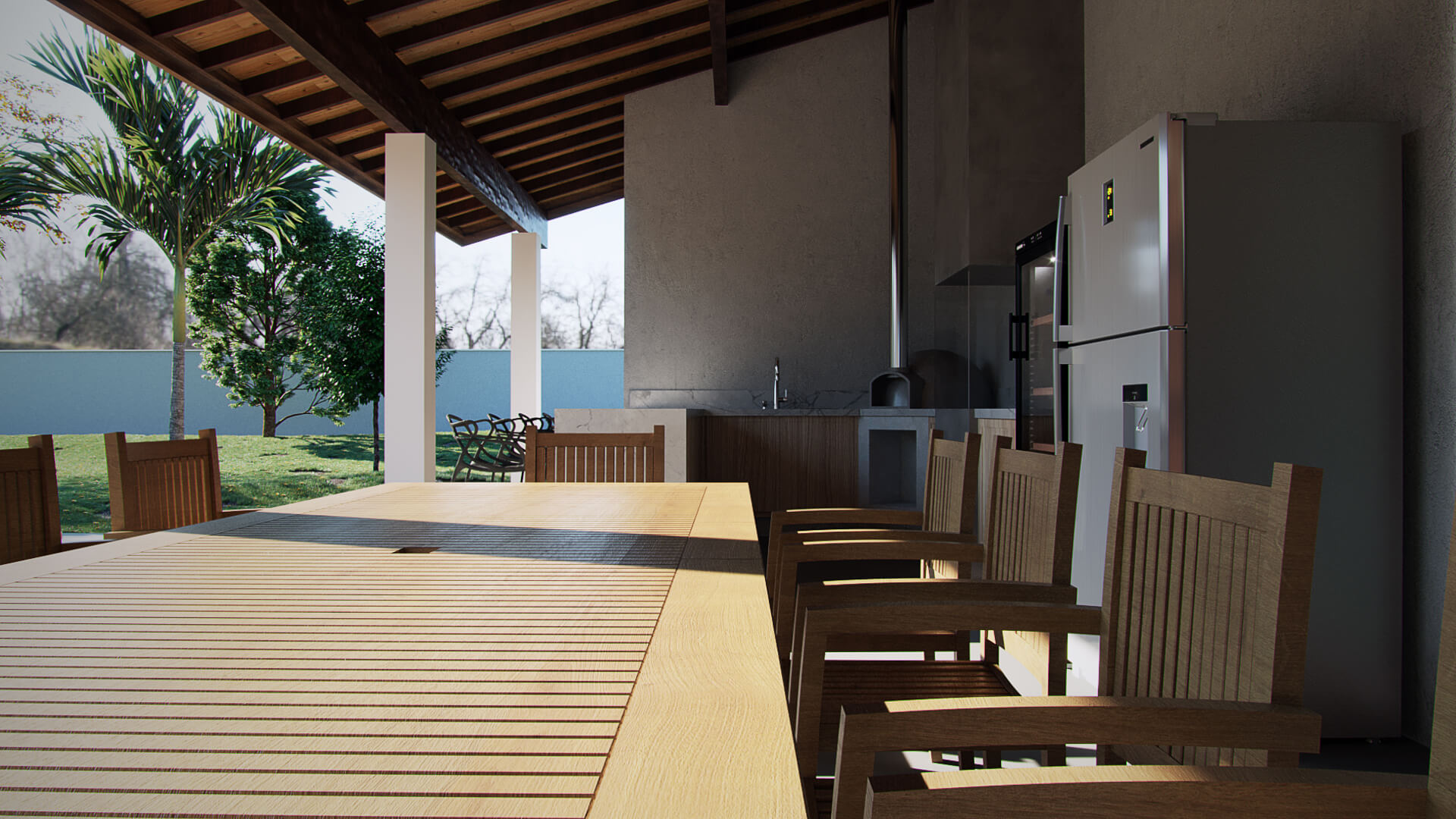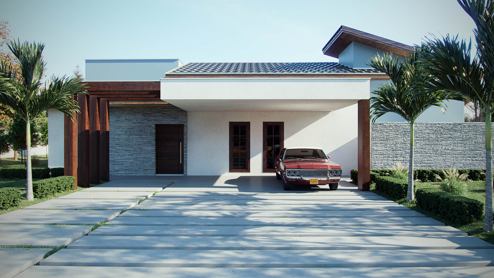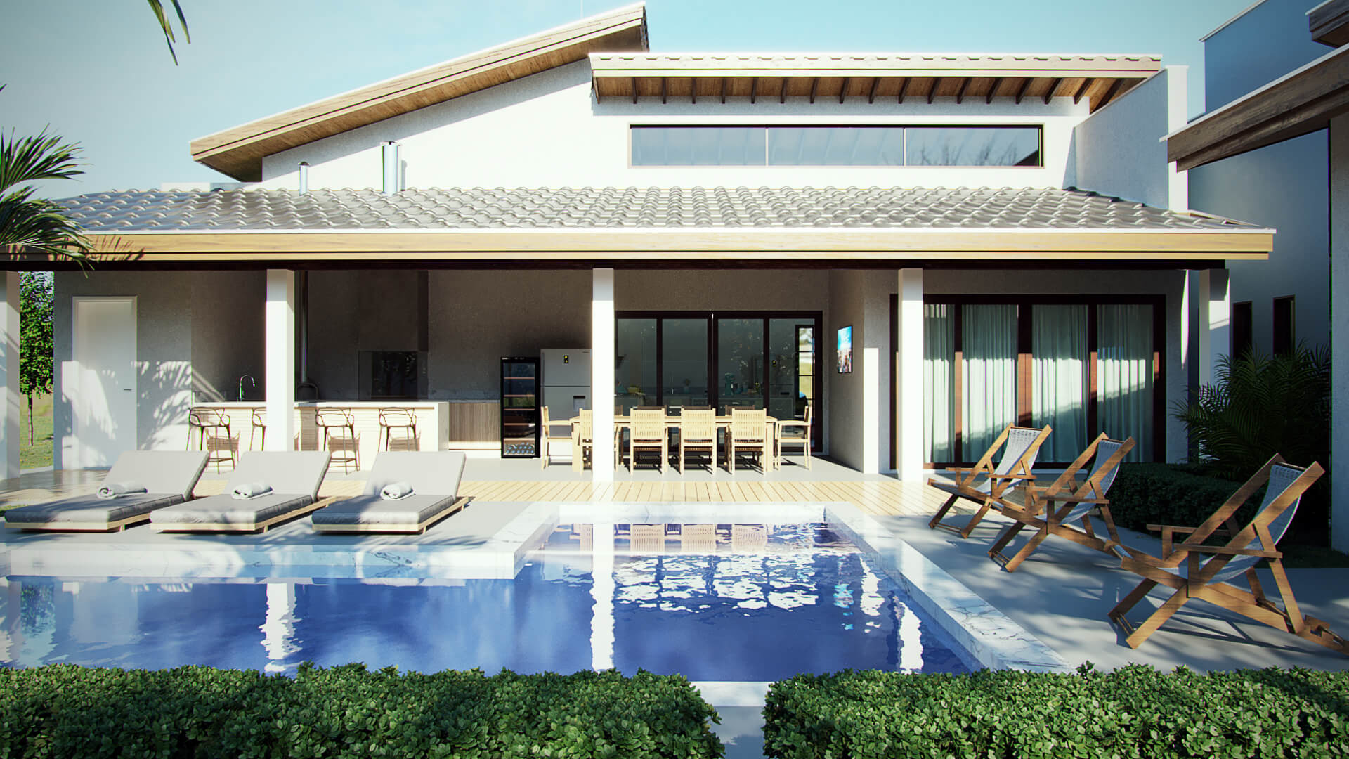 Neste projeto os arquitetos escolheram fazer da natureza o elemento principal. Para o destaque da construção, o telhado aparente deixa a estética mais agradável e cria um dinamismo entre o estilo rústico com uma funcionalidade moderna. As telhas de barro ou cerâmica melhoram o conforto térmico e acústico, além de existirem diversos modelos que mais agrade o cliente. Com amplas portas de vidro entre a área gourmet, a sala de estar e a cozinha melhoram a ventilação e iluminação além de dar a sensação de um espaço totalmente integrado. Com vaga para dois carros, a garagem em balanço adiciona linhas bem definidas em madeira que deixa a fachada com uma perspectiva singular no desenho do projeto. Essa casa de campo usa a madeira como elemento estrutural para a construção que serve de suporte ao telhado e parte da garagem.