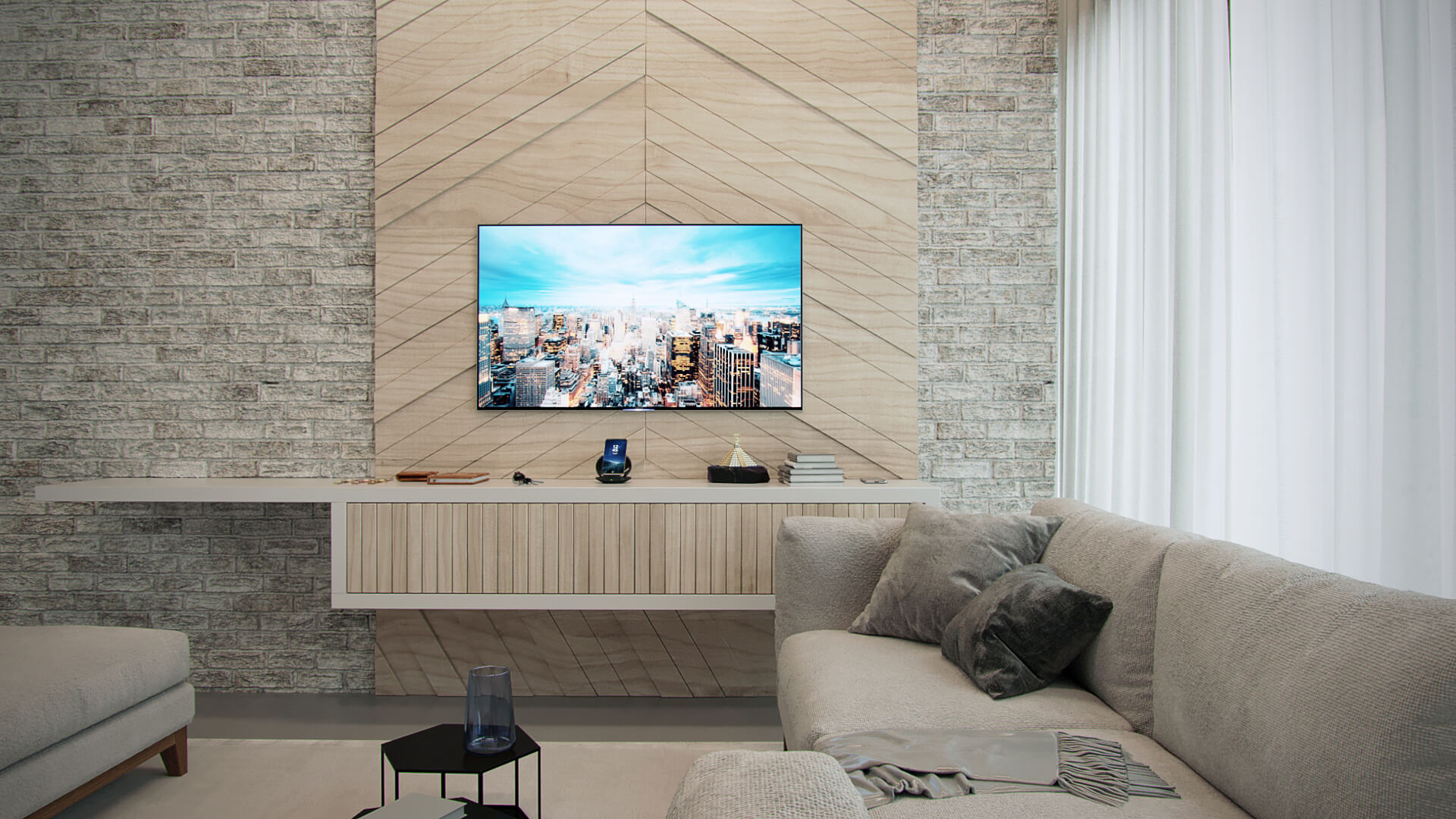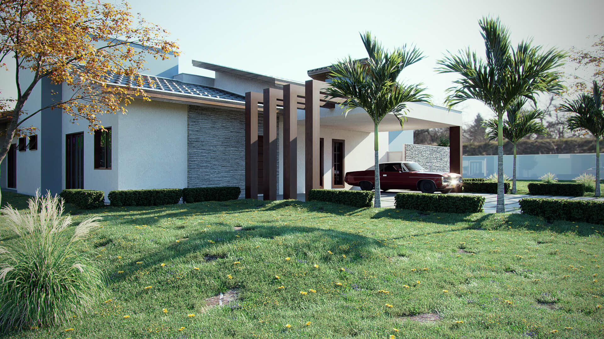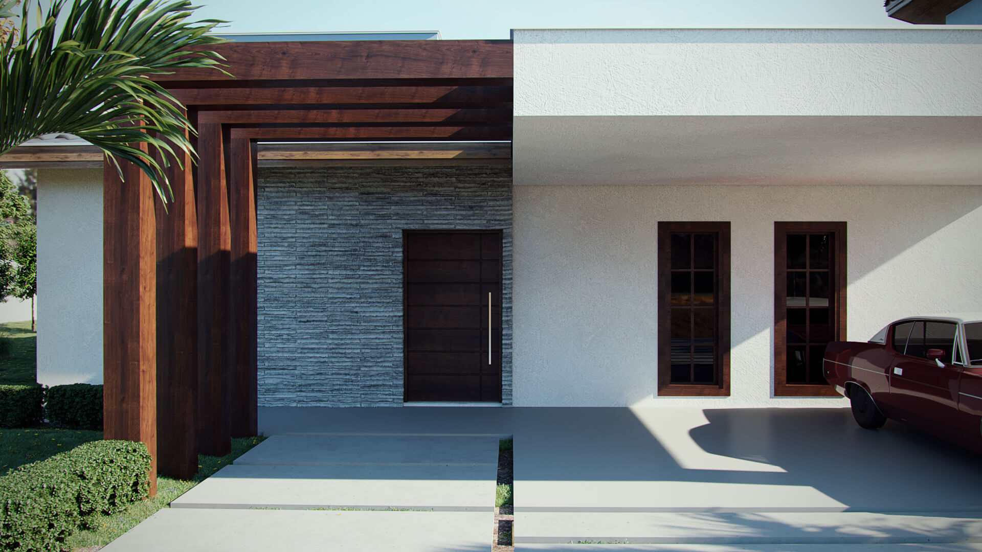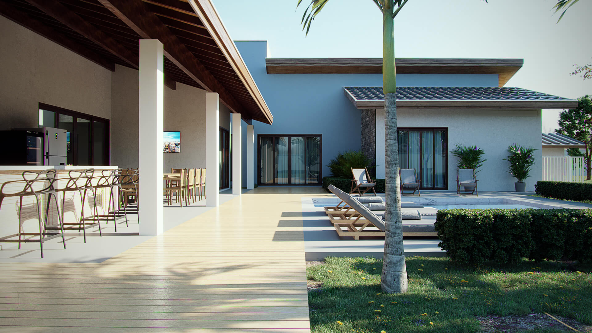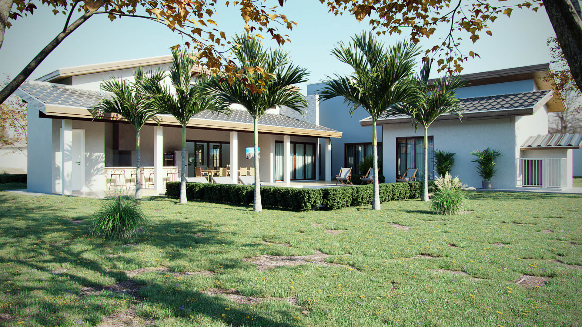 Neste projeto os arquitetos escolheram fazer da natureza o elemento principal. Para o destaque da construção, o telhado aparente deixa a estética mais agradável e cria um dinamismo entre o estilo rústico com uma funcionalidade moderna. As telhas de barro ou cerâmica melhoram o conforto térmico e acústico, além de existirem diversos modelos que mais agrade o cliente. Com amplas portas de vidro entre a área gourmet, a sala de estar e a cozinha melhoram a ventilação e iluminação além de dar a sensação de um espaço totalmente integrado. Com vaga para dois carros, a garagem em balanço adiciona linhas bem definidas em madeira que deixa a fachada com uma perspectiva singular no desenho do projeto. Essa casa de campo usa a madeira como elemento estrutural para a construção que serve de suporte ao telhado e parte da garagem.