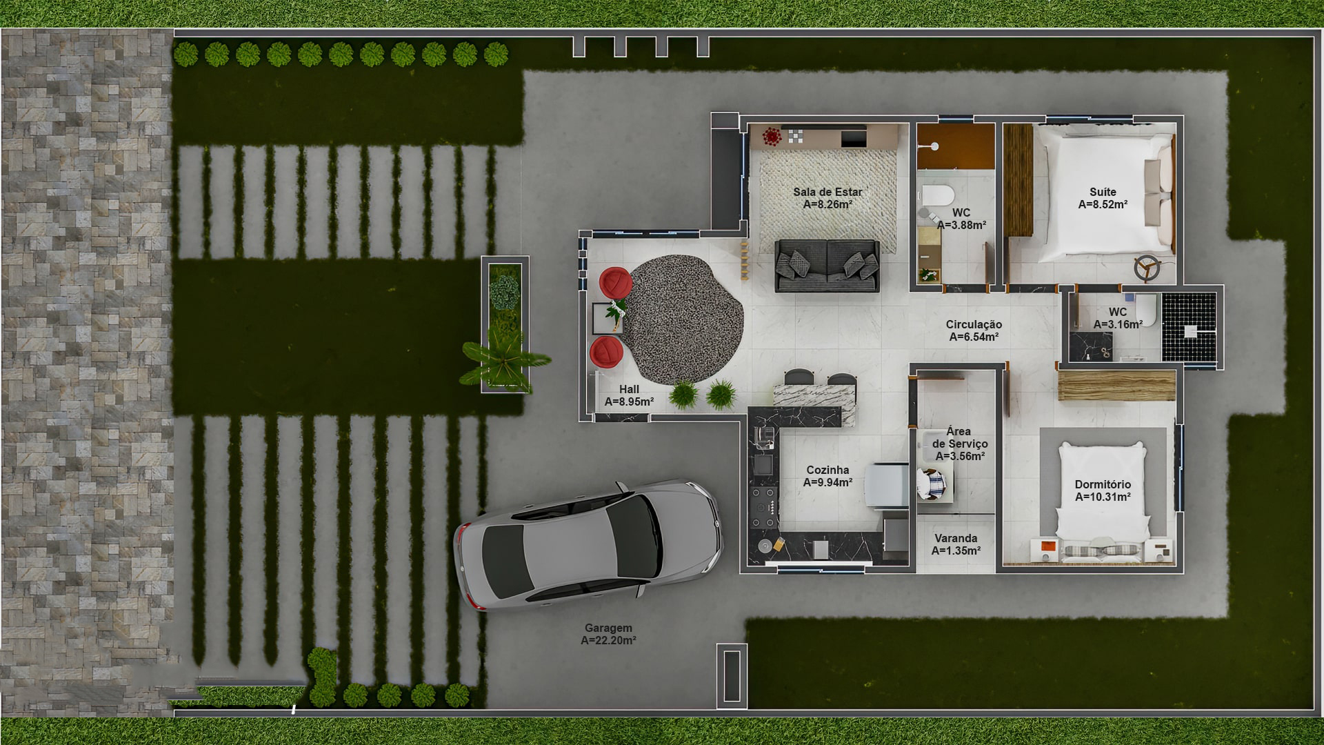 Este é um belo exemplo de um projeto compacto de uma linda casa térrea com 98,00m², com uma fachada espetacular e garagem para dois carros, bastante versátil podendo ser utilizado em uma grande variedade de terrenos, distribuída em nove elegantes ambientes, começando pelo maravilhoso Hall de entrada com ampla vista, integrado a sala de estar e a cozinha, proporcionando uma área social bastante ampla muito agradável e pouco comum em projetos com esta metragem, com um banheiro social para melhor integração do ambiente, essa belíssima casa oferece fácil acesso aos seus 2 dormitórios sendo um deles uma suíte. Este belo projeto oferece conforto, flexibilidade, fácil manutenção sem abrir mão da beleza e harmonia de seus ambientes proporcionando uma experiência única a seus moradores, a casa também oferece uma área de serviço clara e funcional para atender todas as necessidades de sua família.