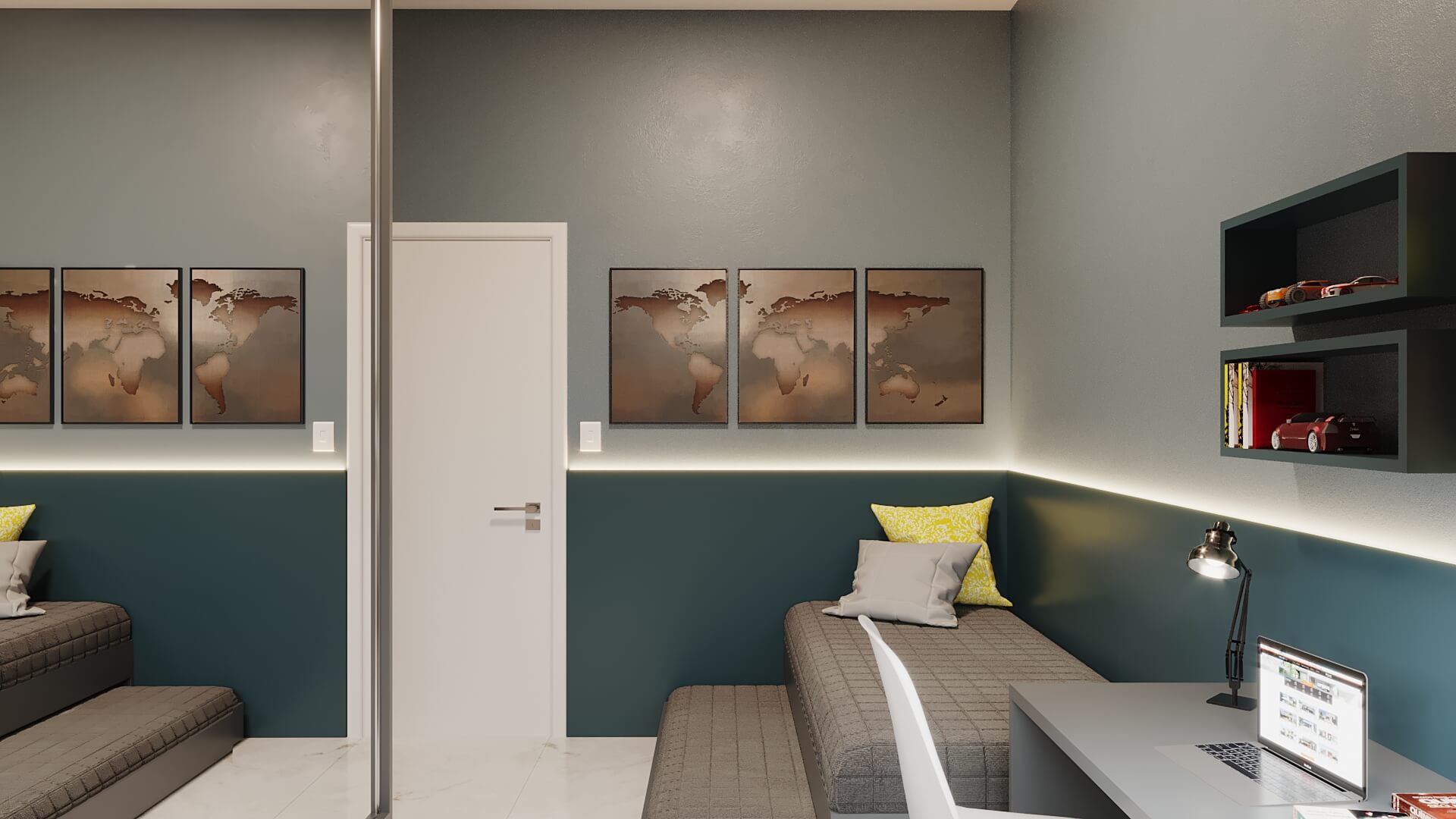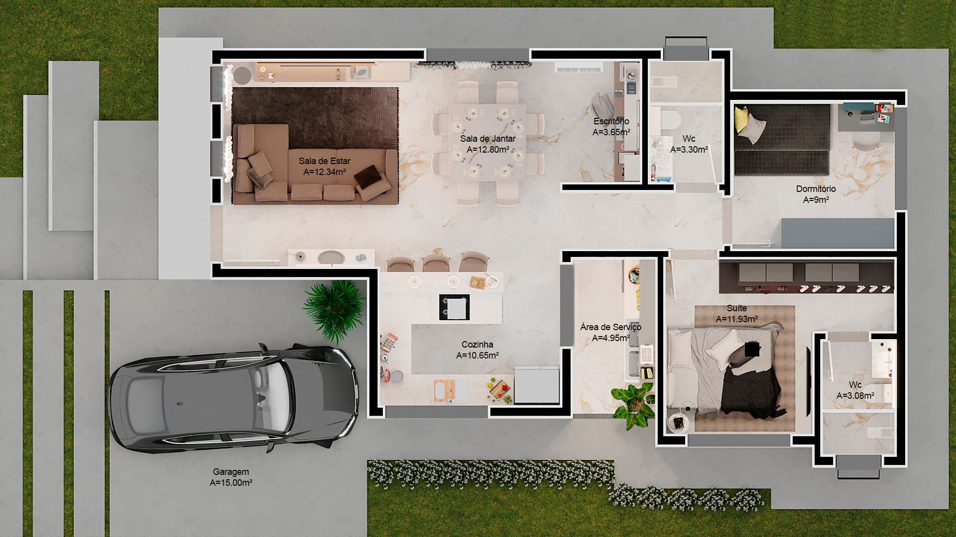 O projeto da casa Azurita foi pensado para tornar da harmonia o ponto-chave para seu desing, nada aqui deve ser complicado! Uma construção simples e lógica, com um conceito aberto que cuida da integração da sala de tv, cozinha e sala de jantar, facilitando o dia a dia de seus moradores, a escolha das tonalidades desses ambientes conversam entre si, que os tornam elegantes e sofisticados, e um escritório inspirador completa esta área social. Já para área privativa, o que prevalece é a disposição regular dos dormitórios, contamos com uma suíte e um dormitório, que estão estrategicamente voltados para o fundo do terreno proporcionando, conforto acústico e privacidade, garantindo uma noite de sono mais tranquila e agradável aos moradores dessa casa. Para um maior dinamismo e praticidade, temos uma lavanderia localizada ao lado cozinha, com um acesso externo isso facilita na hora de descarregar as compras ou ter algum acesso de serviços. Sua planta possui um tamanho adequado para terrenos menores, planejada para o seu bem-estar e conforto, este projeto é perfeito para você!