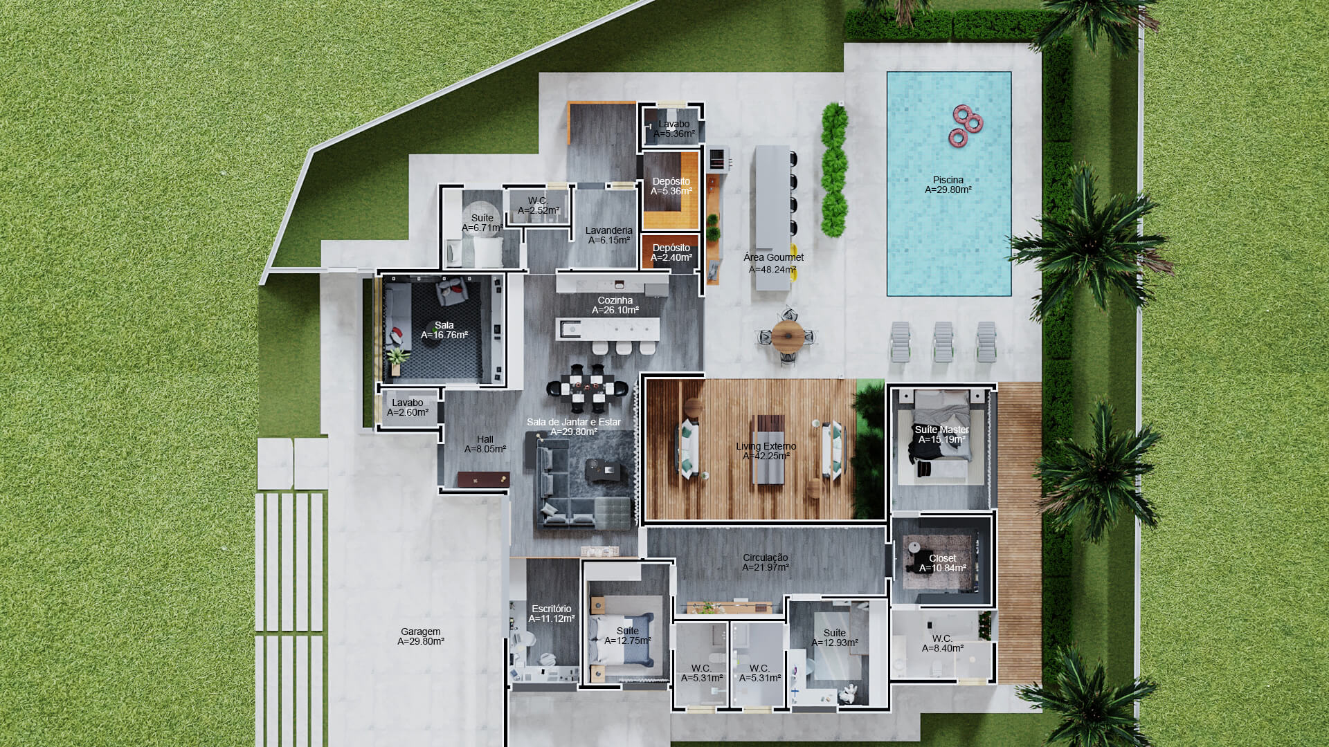 Hoje te levaremos para conhecer o projeto da casa Malásia, um projeto incrível e de deixar qualquer um sem palavras. os acabamentos finos, linhas retas e contraste de cor, texturas e materiais fica visível logo na fachada. A garagem desse sobrado armazena dois carros grandes confortavelmente por estar implantado em um terreno de 32x36m e possui 372m² de área construída.