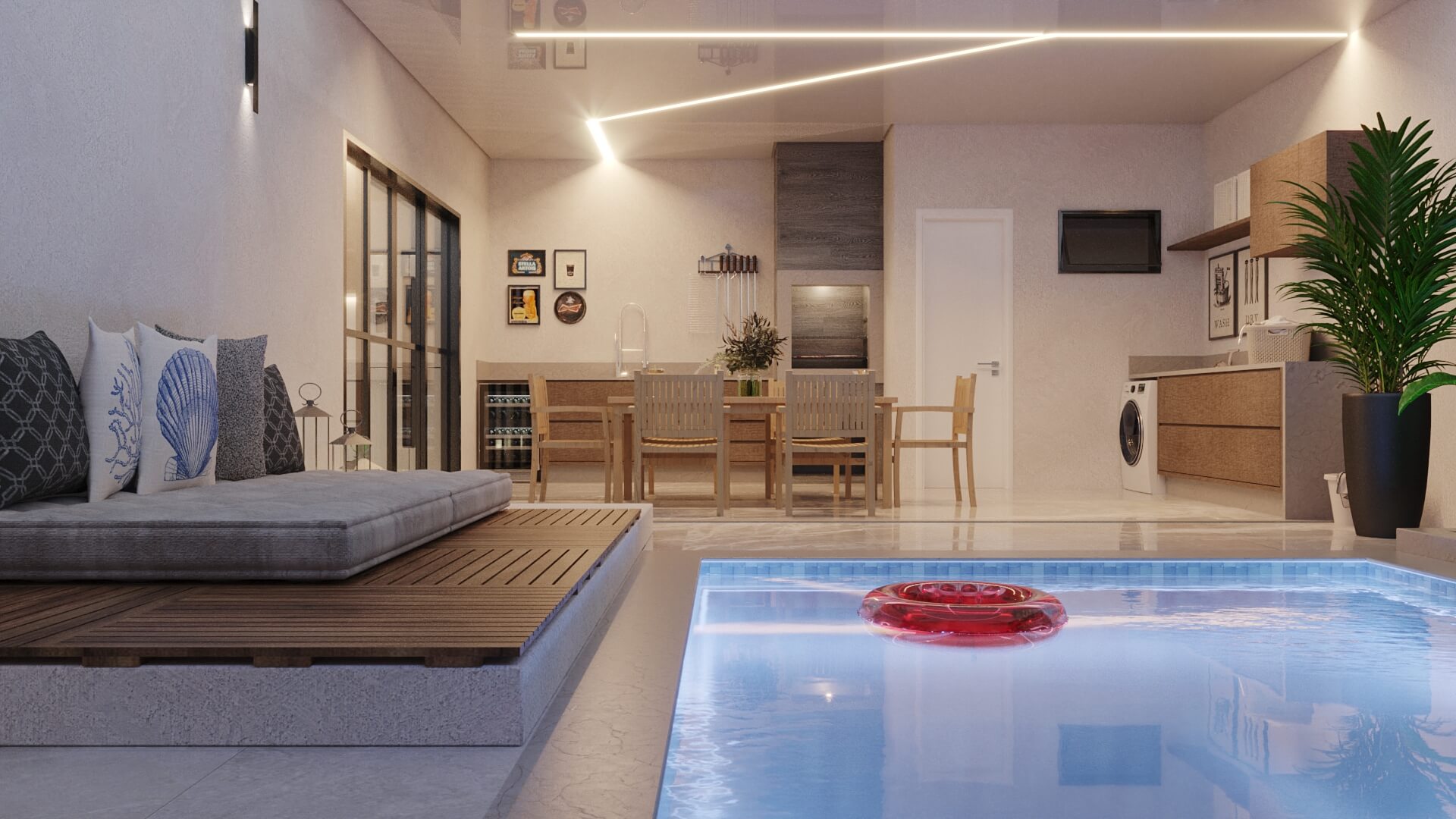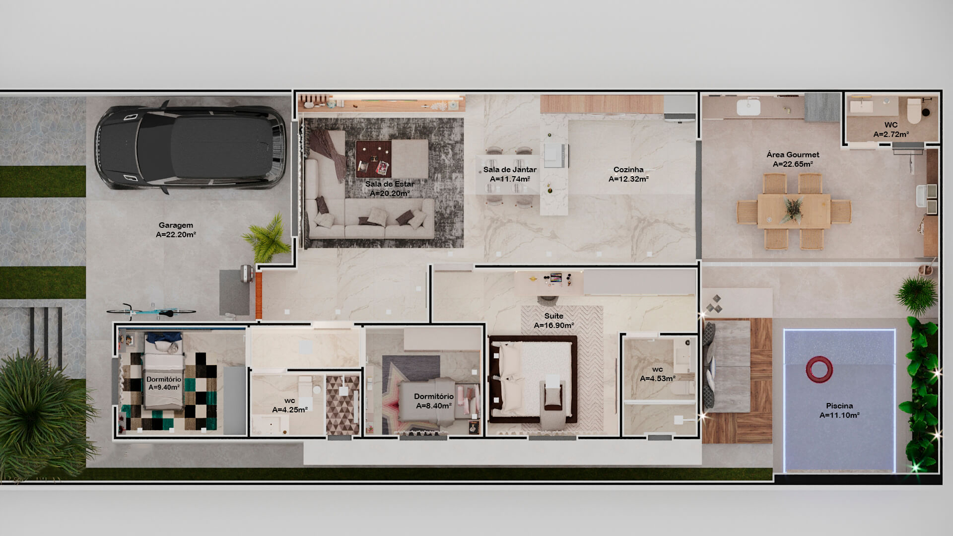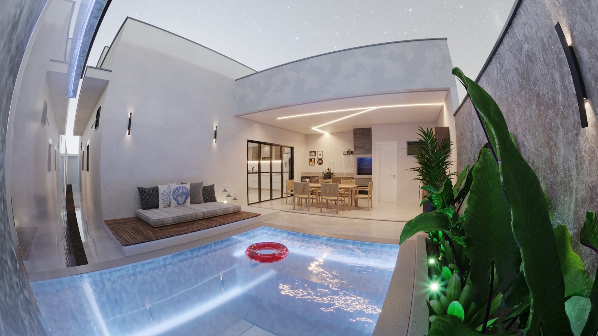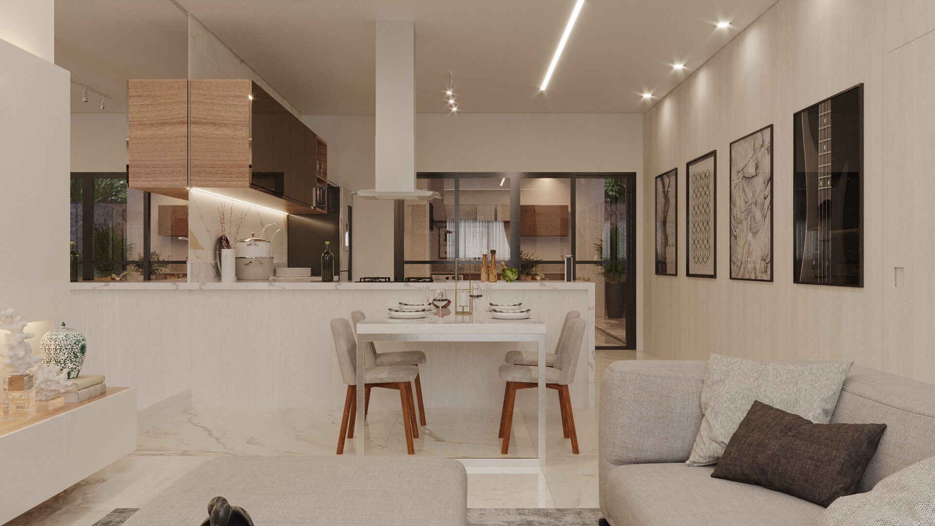 A Casa Zafira é compacta, seu terreno de 10×25 m levanta o projeto através de linhas retas e paleta de cores neutras que expressam elegância e modernidade. Fachada dinâmica com volumetria não-linear para transmitir a sensação de amplitude nas áreas internas. As áreas sociais são integradas, as aberturas opostas aumentam a ventilação cruzada e a iluminação entre os ambientes. Na área interna, detalhes em madeira ganham destaques na sala de estar, deixando o cômodo elegante além de proporcionar aconchego. A disposição dos armários da cozinha e o revestimento das paredes são de tonalidade clara, visa aumentar a sensação de um local mais amplo e higiênico. A área gourmet deixa de lado o hipermodernismo dos móveis da área interna da casa, os tons de madeira contrastam com o tom escolhido para a churrasqueira, deixando o ambiente aconchegante para aproveitar os fins de semana com amigos e familiares.